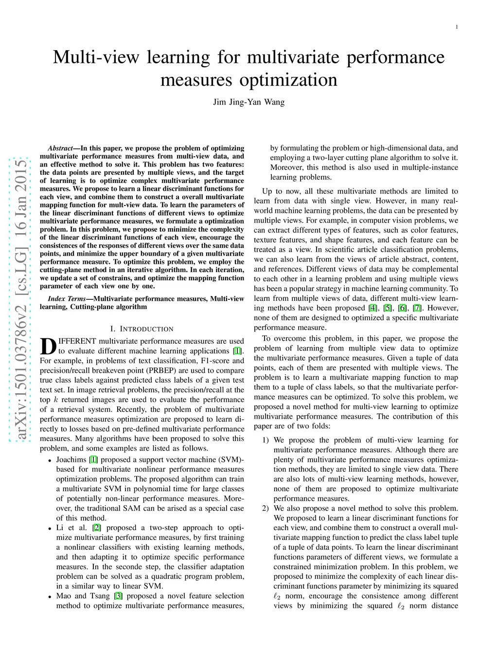 In this paper, we propose the problem of opti- mizing multivariate performance measures from multi-view data, and an effective method to solve it. This problem has two features: the data points are presented by multiple views, and the target of learning is to optimize complex multivariate performance measures. We propose to learn a linear discriminant functions for each view, and combine them to construct a overall multivariate mapping function for mult-view data. To learn the parameters of the linear dis- criminant functions of different views to optimize multivariate performance measures, we formulate a optimization problem. In this problem, we propose to minimize the complexity of the linear discriminant functions of each view, encourage the consistences of the responses of different views over the same data points, and minimize the upper boundary of a given multivariate performance measure. To optimize this problem, we employ the cutting-plane method in an iterative algorithm. In each iteration, we update a set of constrains, and optimize the mapping function parameter of each view one by one.