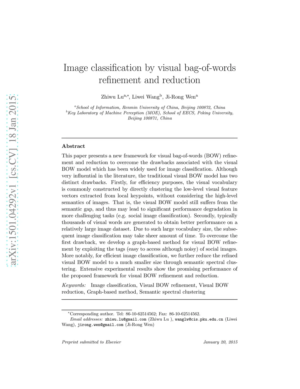 Image classification by visual bag-of-words refinement and reduction