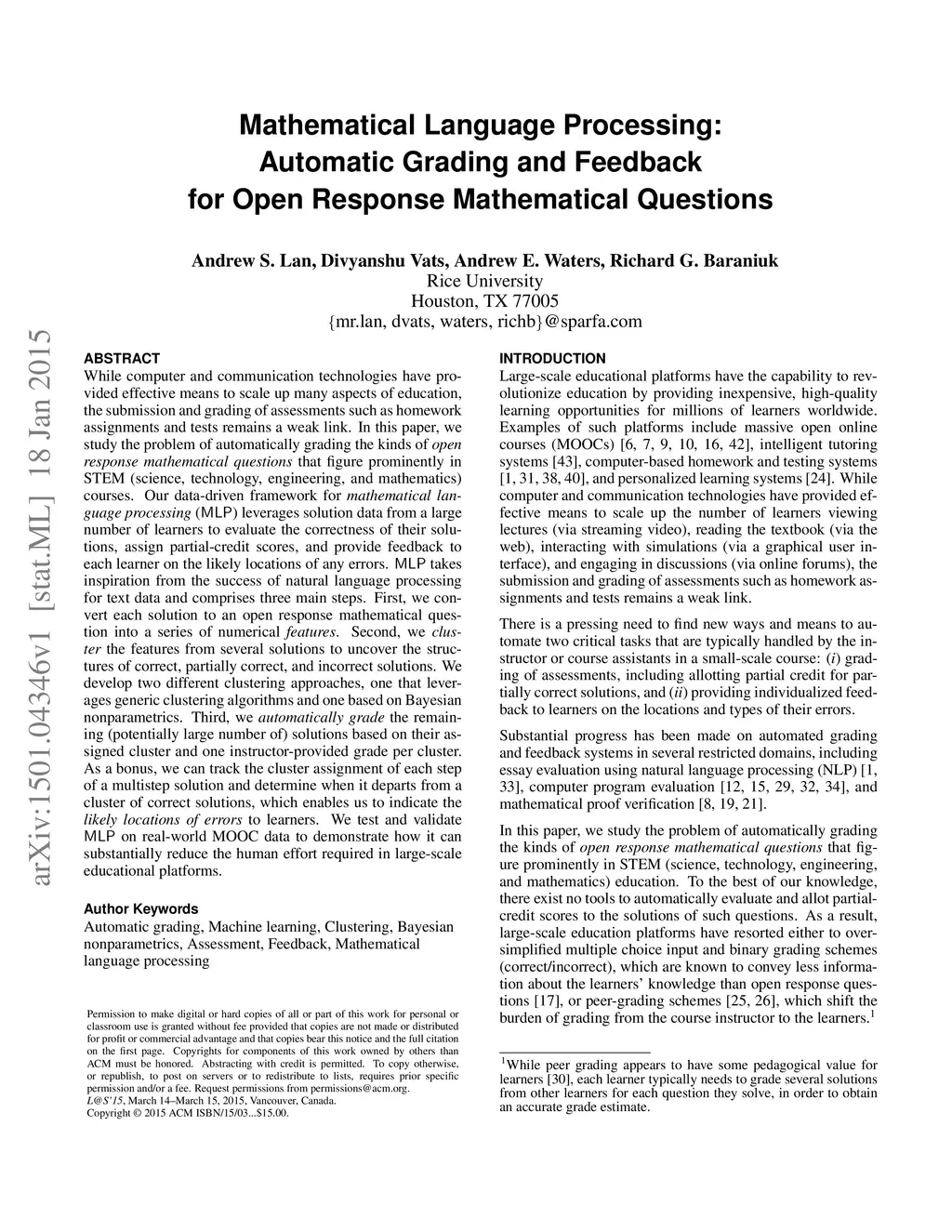 Mathematical Language Processing: Automatic Grading and Feedback for