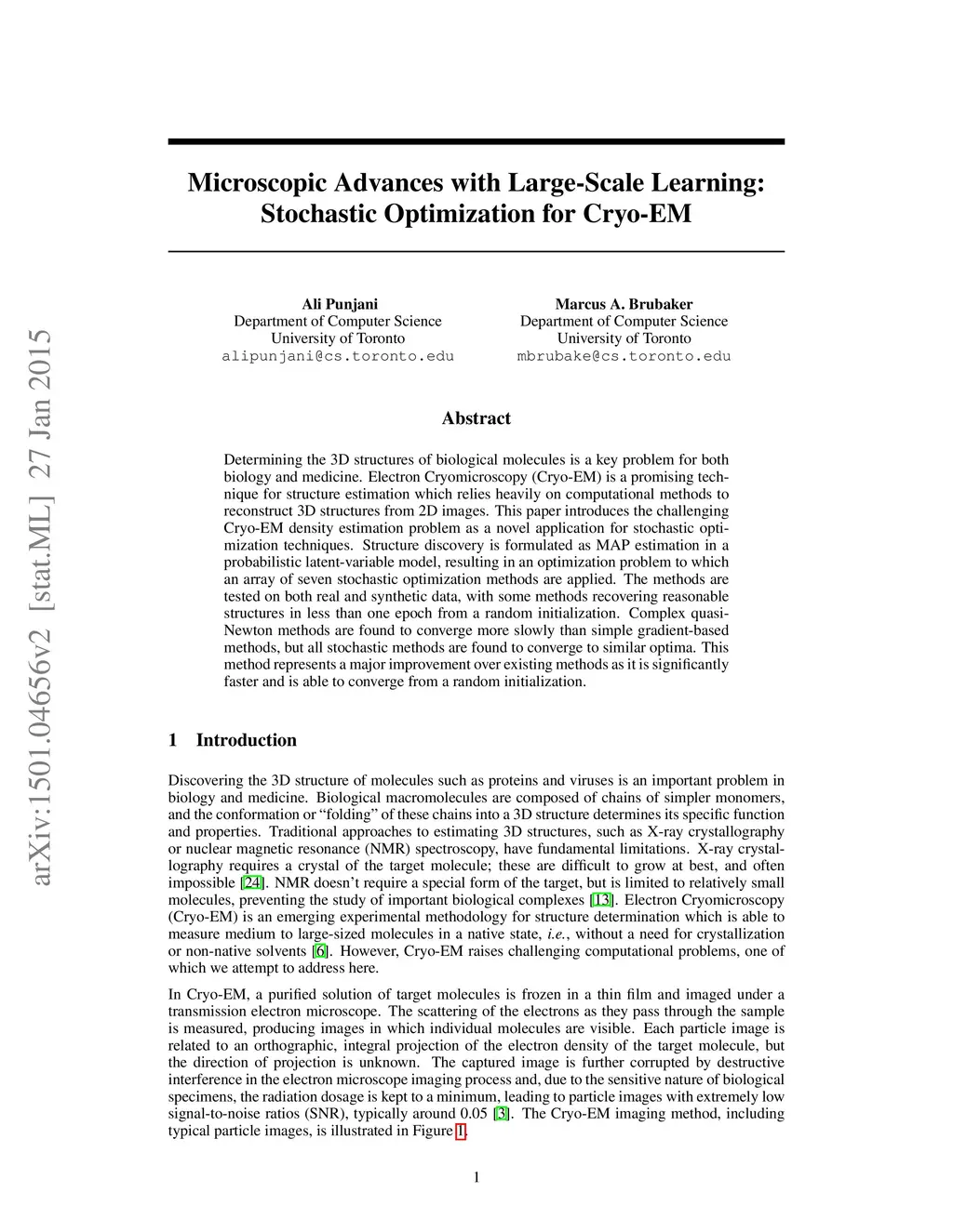 Determining the 3D structures of biological molecules is a key problem for both biology and medicine. Electron Cryomicroscopy (Cryo-EM) is a promising technique for structure estimation which relies heavily on computational methods to reconstruct 3D structures from 2D images. This paper introduces the challenging Cryo-EM density estimation problem as a novel application for stochastic optimization techniques. Structure discovery is formulated as MAP estimation in a probabilistic latent-variable model, resulting in an optimization problem to which an array of seven stochastic optimization methods are applied. The methods are tested on both real and synthetic data, with some methods recovering reasonable structures in less than one epoch from a random initialization. Complex quasi-Newton methods are found to converge more slowly than simple gradient-based methods, but all stochastic methods are found to converge to similar optima. This method represents a major improvement over existing methods as it is significantly faster and is able to converge from a random initialization.