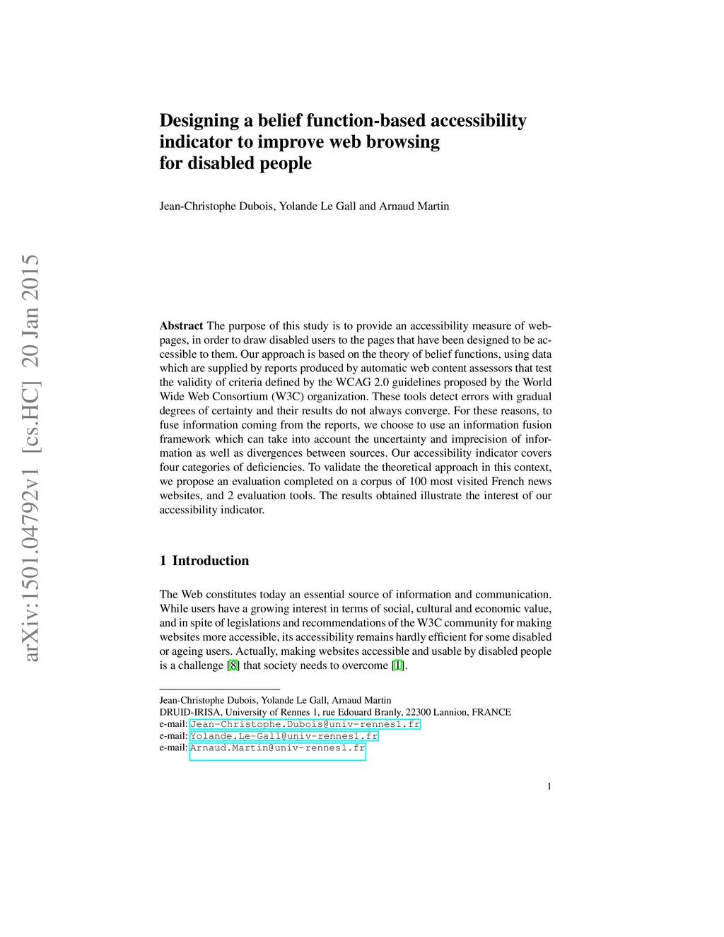 The purpose of this study is to provide an accessibility measure of web-pages, in order to draw disabled users to the pages that have been designed to be ac-cessible to them. Our approach is based on the theory of belief functions, using data which are supplied by reports produced by automatic web content assessors that test the validity of criteria defined by the WCAG 2.0 guidelines proposed by the World Wide Web Consortium (W3C) organization. These tools detect errors with gradual degrees of certainty and their results do not always converge. For these reasons, to fuse information coming from the reports, we choose to use an information fusion framework which can take into account the uncertainty and imprecision of infor-mation as well as divergences between sources. Our accessibility indicator covers four categories of deficiencies. To validate the theoretical approach in this context, we propose an evaluation completed on a corpus of 100 most visited French news websites, and 2 evaluation tools. The results obtained illustrate the interest of our accessibility indicator.