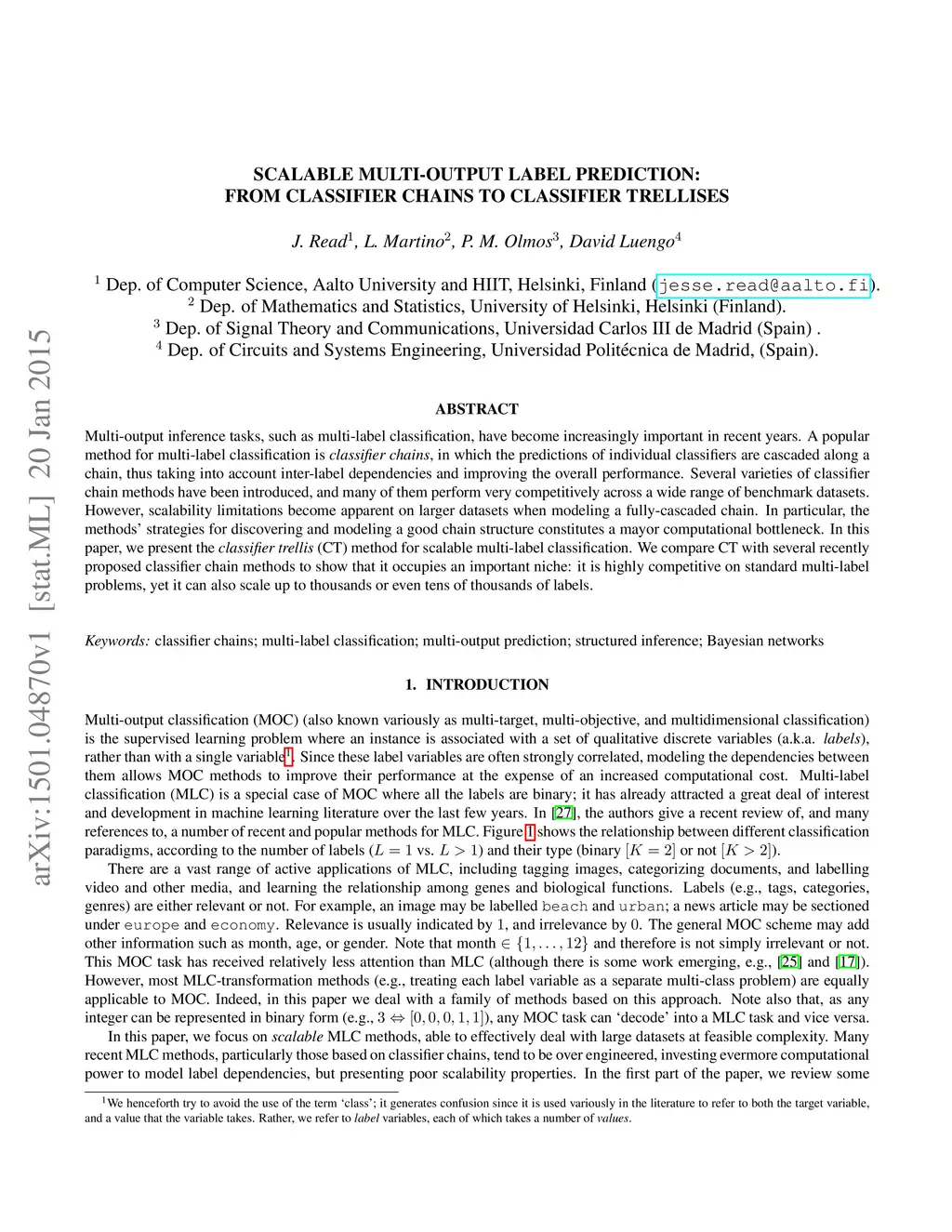 Multi-output inference tasks, such as multi-label classification, have become increasingly important in recent years. A popular method for multi-label classification is classifier chains, in which the predictions of individual classifiers are cascaded along a chain, thus taking into account inter-label dependencies and improving the overall performance. Several varieties of classifier chain methods have been introduced, and many of them perform very competitively across a wide range of benchmark datasets. However, scalability limitations become apparent on larger datasets when modeling a fully-cascaded chain. In particular, the methods' strategies for discovering and modeling a good chain structure constitutes a mayor computational bottleneck. In this paper, we present the classifier trellis (CT) method for scalable multi-label classification. We compare CT with several recently proposed classifier chain methods to show that it occupies an important niche: it is highly competitive on standard multi-label problems, yet it can also scale up to thousands or even tens of thousands of labels.