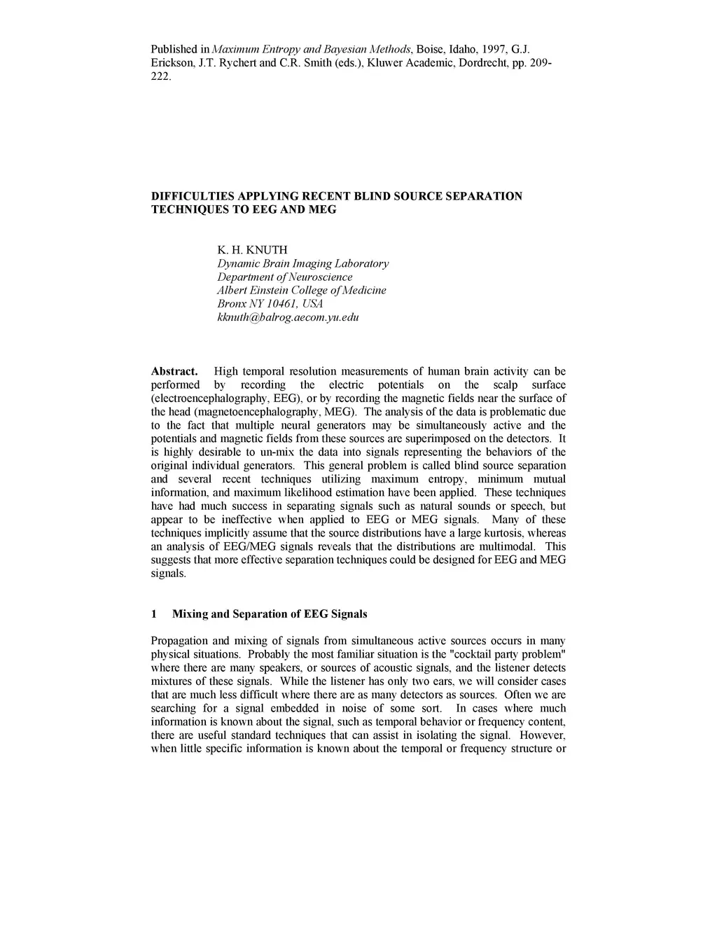 High temporal resolution measurements of human brain activity can be performed by recording the electric potentials on the scalp surface (electroencephalography, EEG), or by recording the magnetic fields near the surface of the head (magnetoencephalography, MEG). The analysis of the data is problematic due to the fact that multiple neural generators may be simultaneously active and the potentials and magnetic fields from these sources are superimposed on the detectors. It is highly desirable to un-mix the data into signals representing the behaviors of the original individual generators. This general problem is called blind source separation and several recent techniques utilizing maximum entropy, minimum mutual information, and maximum likelihood estimation have been applied. These techniques have had much success in separating signals such as natural sounds or speech, but appear to be ineffective when applied to EEG or MEG signals. Many of these techniques implicitly assume that the source distributions have a large kurtosis, whereas an analysis of EEG/MEG signals reveals that the distributions are multimodal. This suggests that more effective separation techniques could be designed for EEG and MEG signals.
