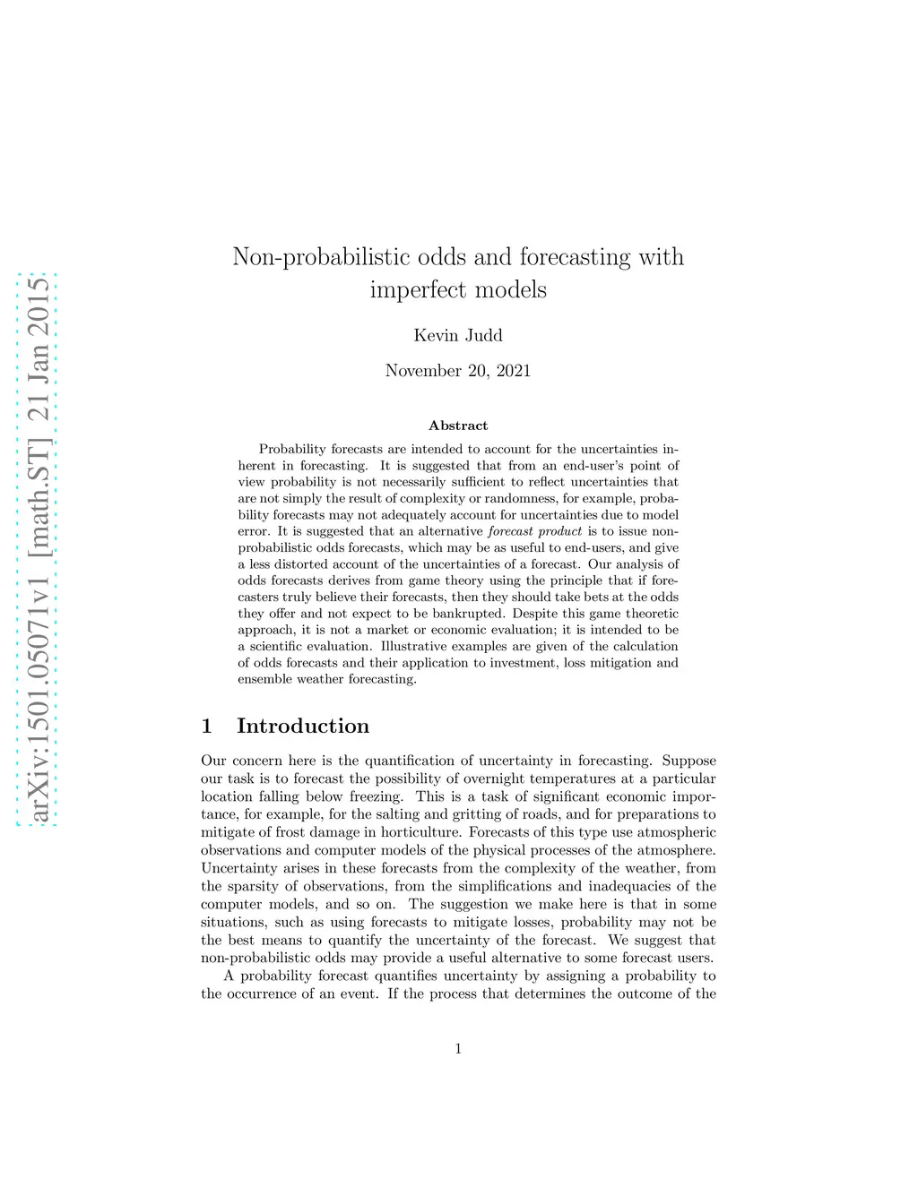 Probability forecasts are intended to account for the uncertainties inherent in forecasting. It is suggested that from an end-user's point of view probability is not necessarily sufficient to reflect uncertainties that are not simply the result of complexity or randomness, for example, probability forecasts may not adequately account for uncertainties due to model error. It is suggested that an alternative forecast product is to issue non-probabilistic odds forecasts, which may be as useful to end-users, and give a less distorted account of the uncertainties of a forecast. Our analysis of odds forecasts derives from game theory using the principle that if forecasters truly believe their forecasts, then they should take bets at the odds they offer and not expect to be bankrupted. Despite this game theoretic approach, it is not a market or economic evaluation; it is intended to be a scientific evaluation. Illustrative examples are given of the calculation of odds forecasts and their application to investment, loss mitigation and ensemble weather forecasting.