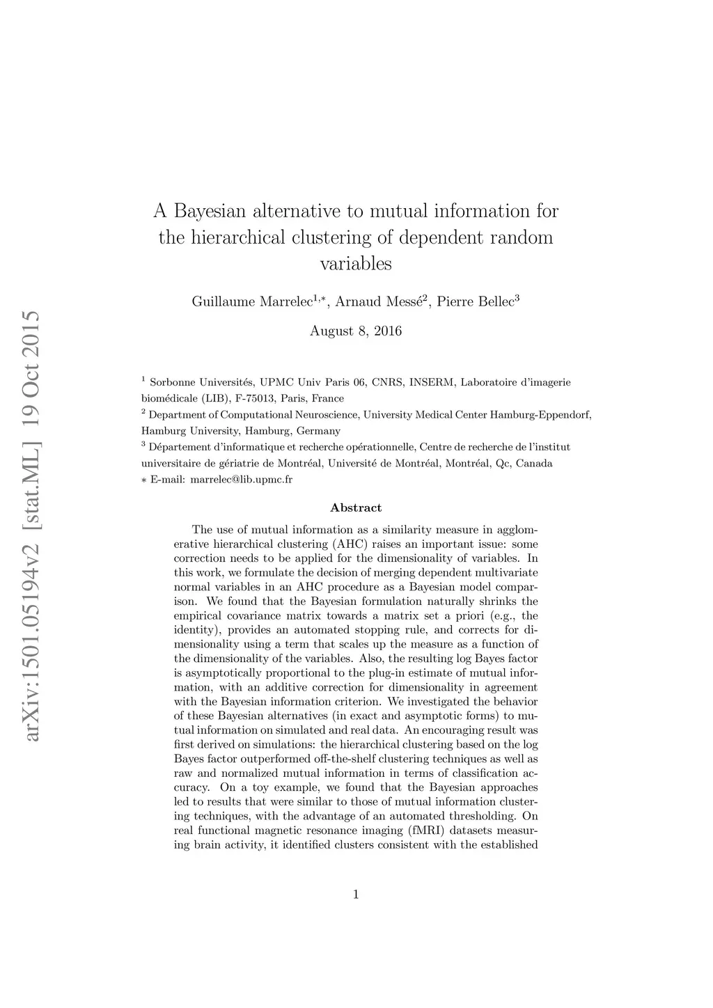 The use of mutual information as a similarity measure in agglomerative hierarchical clustering (AHC) raises an important issue: some correction needs to be applied for the dimensionality of variables. In this work, we formulate the decision of merging dependent multivariate normal variables in an AHC procedure as a Bayesian model comparison. We found that the Bayesian formulation naturally shrinks the empirical covariance matrix towards a matrix set a priori (e.g., the identity), provides an automated stopping rule, and corrects for dimensionality using a term that scales up the measure as a function of the dimensionality of the variables. Also, the resulting log Bayes factor is asymptotically proportional to the plug-in estimate of mutual information, with an additive correction for dimensionality in agreement with the Bayesian information criterion. We investigated the behavior of these Bayesian alternatives (in exact and asymptotic forms) to mutual information on simulated and real data. An encouraging result was first derived on simulations: the hierarchical clustering based on the log Bayes factor outperformed off-the-shelf clustering techniques as well as raw and normalized mutual information in terms of classification accuracy. On a toy example, we found that the Bayesian approaches led to results that were similar to those of mutual information clustering techniques, with the advantage of an automated thresholding. On real functional magnetic resonance imaging (fMRI) datasets measuring brain activity, it identified clusters consistent with the established outcome of standard procedures. On this application, normalized mutual information had a highly atypical behavior, in the sense that it systematically favored very large clusters. These initial experiments suggest that the proposed Bayesian alternatives to mutual information are a useful new tool for hierarchical clustering.