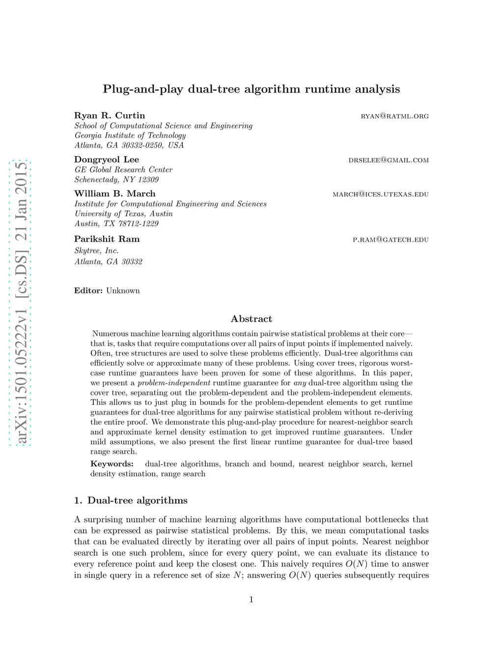 Numerous machine learning algorithms contain pairwise statistical problems at their core---that is, tasks that require computations over all pairs of input points if implemented naively. Often, tree structures are used to solve these problems efficiently. Dual-tree algorithms can efficiently solve or approximate many of these problems. Using cover trees, rigorous worst-case runtime guarantees have been proven for some of these algorithms. In this paper, we present a problem-independent runtime guarantee for any dual-tree algorithm using the cover tree, separating out the problem-dependent and the problem-independent elements. This allows us to just plug in bounds for the problem-dependent elements to get runtime guarantees for dual-tree algorithms for any pairwise statistical problem without re-deriving the entire proof. We demonstrate this plug-and-play procedure for nearest-neighbor search and approximate kernel density estimation to get improved runtime guarantees. Under mild assumptions, we also present the first linear runtime guarantee for dual-tree based range search.