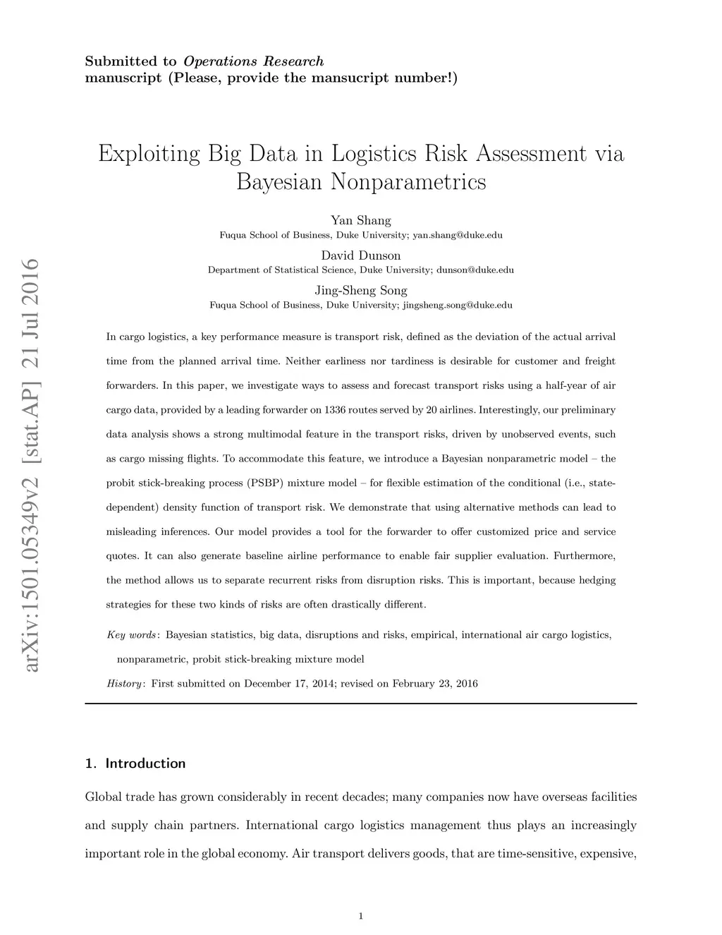 In cargo logistics, a key performance measure is transport risk, defined as the deviation of the actual arrival time from the planned arrival time. Neither earliness nor tardiness is desirable for customer and freight forwarders. In this paper, we investigate ways to assess and forecast transport risks using a half-year of air cargo data, provided by a leading forwarder on 1336 routes served by 20 airlines. Interestingly, our preliminary data analysis shows a strong multimodal feature in the transport risks, driven by unobserved events, such as cargo missing flights. To accommodate this feature, we introduce a Bayesian nonparametric model -- the probit stick-breaking process (PSBP) mixture model -- for flexible estimation of the conditional (i.e., state-dependent) density function of transport risk. We demonstrate that using simpler methods, such as OLS linear regression, can lead to misleading inferences. Our model provides a tool for the forwarder to offer customized price and service quotes. It can also generate baseline airline performance to enable fair supplier evaluation. Furthermore, the method allows us to separate recurrent risks from disruption risks. This is important, because hedging strategies for these two kinds of risks are often drastically different.