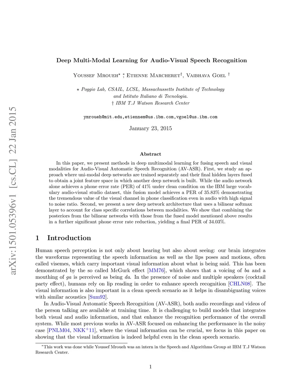In this paper, we present methods in deep multimodal learning for fusing speech and visual modalities for Audio-Visual Automatic Speech Recognition (AV-ASR). First, we study an approach where uni-modal deep networks are trained separately and their final hidden layers fused to obtain a joint feature space in which another deep network is built. While the audio network alone achieves a phone error rate (PER) of under clean condition on the IBM large vocabulary audio-visual studio dataset, this fusion model achieves a PER of demonstrating the tremendous value of the visual channel in phone classification even in audio with high signal to noise ratio. Second, we present a new deep network architecture that uses a bilinear softmax layer to account for class specific correlations between modalities. We show that combining the posteriors from the bilinear networks with those from the fused model mentioned above results in a further significant phone error rate reduction, yielding a final PER of .