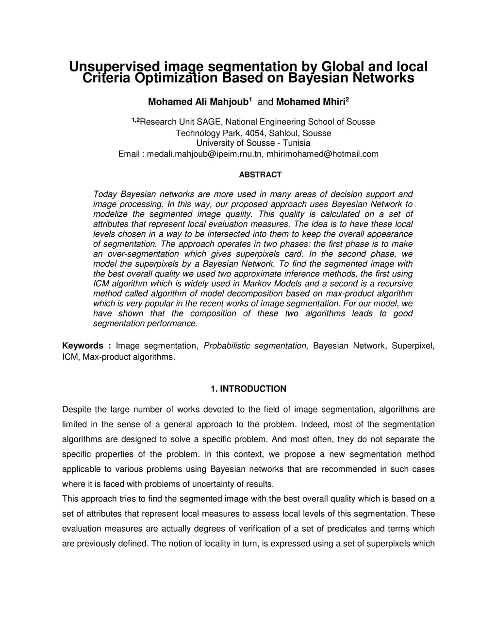 Today Bayesian networks are more used in many areas of decision support and image processing. In this way, our proposed approach uses Bayesian Network to modelize the segmented image quality. This quality is calculated on a set of attributes that represent local evaluation measures. The idea is to have these local levels chosen in a way to be intersected into them to keep the overall appearance of segmentation. The approach operates in two phases: the first phase is to make an over-segmentation which gives superpixels card. In the second phase, we model the superpixels by a Bayesian Network. To find the segmented image with the best overall quality we used two approximate inference methods, the first using ICM algorithm which is widely used in Markov Models and a second is a recursive method called algorithm of model decomposition based on max-product algorithm which is very popular in the recent works of image segmentation. For our model, we have shown that the composition of these two algorithms leads to good segmentation performance.