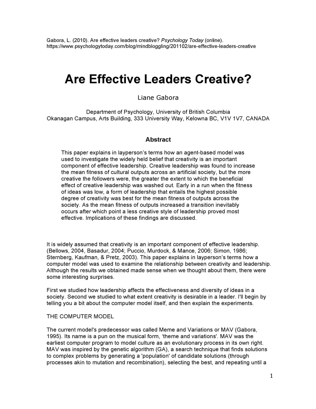 This paper explains in layperson's terms how an agent-based model was used to investigate the widely held belief that creativity is an important component of effective leadership. Creative leadership was found to increase the mean fitness of cultural outputs across an artificial society, but the more creative the followers were, the greater the extent to which the beneficial effect of creative leadership was washed out. Early in a run when the fitness of ideas was low, a form of leadership that entails the highest possible degree of creativity was best for the mean fitness of outputs across the society. As the mean fitness of outputs increased a transition inevitably occurs after which point a less creative style of leadership proved most effective. Implications of these findings are discussed.