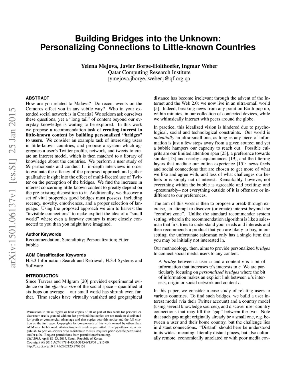 How are you related to Malawi? Do recent events on the Comoros effect you in any subtle way? Who in your extended social network is in Croatia? We seldom ask ourselves these questions, yet a "long tail" of content beyond our everyday knowledge is waiting to be explored. In this work we propose a recommendation task of creating interest in little-known content by building personalized "bridges" to users. We consider an example task of interesting users in little-known countries, and propose a system which aggregates a user's Twitter profile, network, and tweets to create an interest model, which is then matched to a library of knowledge about the countries. We perform a user study of 69 participants and conduct 11 in-depth interviews in order to evaluate the efficacy of the proposed approach and gather qualitative insight into the effect of multi-faceted use of Twitter on the perception of the bridges. We find the increase in interest concerning little-known content to greatly depend on the pre-existing disposition to it. Additionally, we discover a set of vital properties good bridges must possess, including recency, novelty, emotiveness, and a proper selection of language. Using the proposed approach we aim to harvest the "invisible connections" to make explicit the idea of a "small world" where even a faraway country is more closely connected to you than you might have imagined.