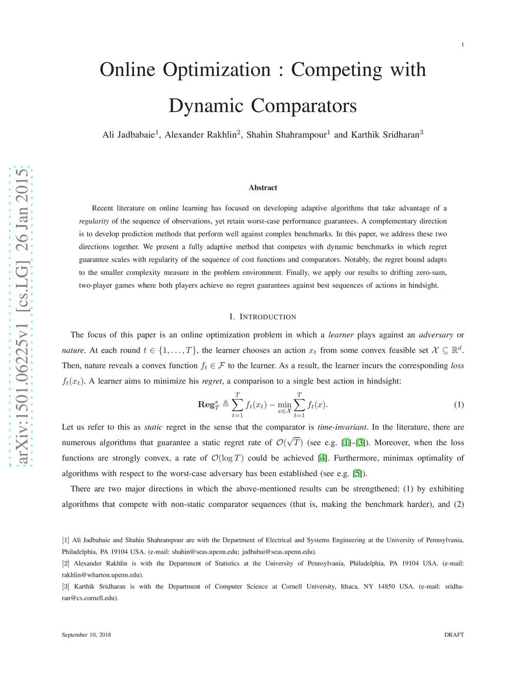 Recent literature on online learning has focused on developing adaptive algorithms that take advantage of a regularity of the sequence of observations, yet retain worst-case performance guarantees. A complementary direction is to develop prediction methods that perform well against complex benchmarks. In this paper, we address these two directions together. We present a fully adaptive method that competes with dynamic benchmarks in which regret guarantee scales with regularity of the sequence of cost functions and comparators. Notably, the regret bound adapts to the smaller complexity measure in the problem environment. Finally, we apply our results to drifting zero-sum, two-player games where both players achieve no regret guarantees against best sequences of actions in hindsight.