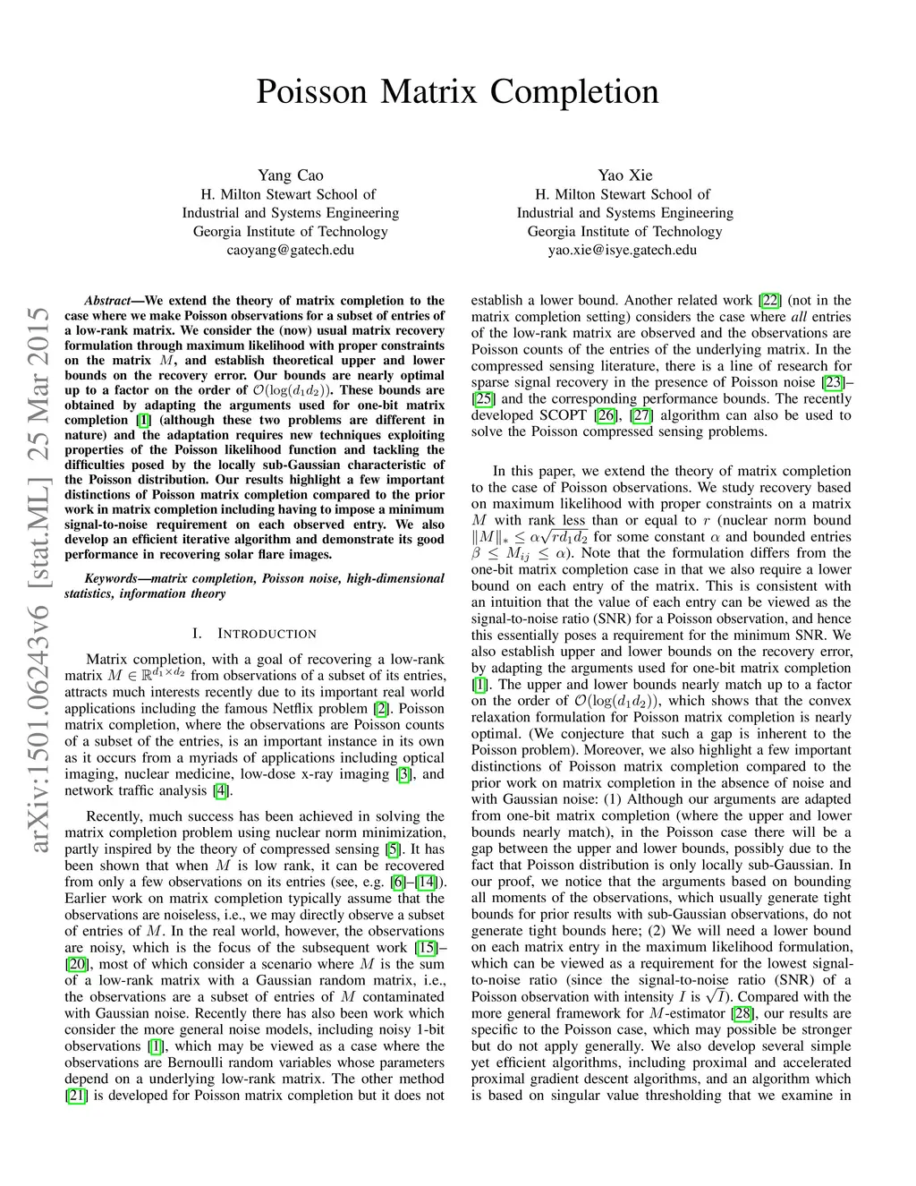 We extend the theory of matrix completion to the case where we make Poisson observations for a subset of entries of a low-rank matrix. We consider the (now) usual matrix recovery formulation through maximum likelihood with proper constraints on the matrix , and establish theoretical upper and lower bounds on the recovery error. Our bounds are nearly optimal up to a factor on the order of . These bounds are obtained by adapting the arguments used for one-bit matrix completion \cite{davenport20121} (although these two problems are different in nature) and the adaptation requires new techniques exploiting properties of the Poisson likelihood function and tackling the difficulties posed by the locally sub-Gaussian characteristic of the Poisson distribution. Our results highlight a few important distinctions of Poisson matrix completion compared to the prior work in matrix completion including having to impose a minimum signal-to-noise requirement on each observed entry. We also develop an efficient iterative algorithm and demonstrate its good performance in recovering solar flare images.