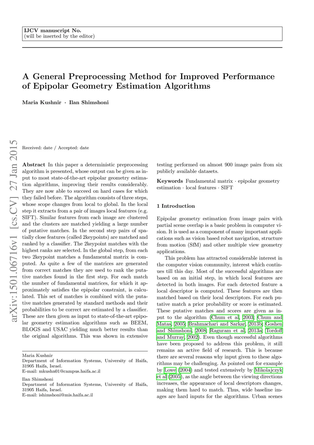 In this paper a deterministic preprocessing algorithm is presented, whose output can be given as input to most state-of-the-art epipolar geometry estimation algorithms, improving their results considerably. They are now able to succeed on hard cases for which they failed before. The algorithm consists of three steps, whose scope changes from local to global. In the local step it extracts from a pair of images local features (e.g. SIFT). Similar features from each image are clustered and the clusters are matched yielding a large number of putative matches. In the second step pairs of spatially close features (called 2keypoints) are matched and ranked by a classifier. The 2keypoint matches with the highest ranks are selected. In the global step, from each two 2keypoint matches a fundamental matrix is computed. As quite a few of the matrices are generated from correct matches they are used to rank the putative matches found in the first step. For each match the number of fundamental matrices, for which it approximately satisfies the epipolar constraint, is calculated. This set of matches is combined with the putative matches generated by standard methods and their probabilities to be correct are estimated by a classifier. These are then given as input to state-of-the-art epipolar geometry estimation algorithms such as BEEM, BLOGS and USAC yielding much better results than the original algorithms. This was shown in extensive testing performed on almost 900 image pairs from six publicly available data-sets.