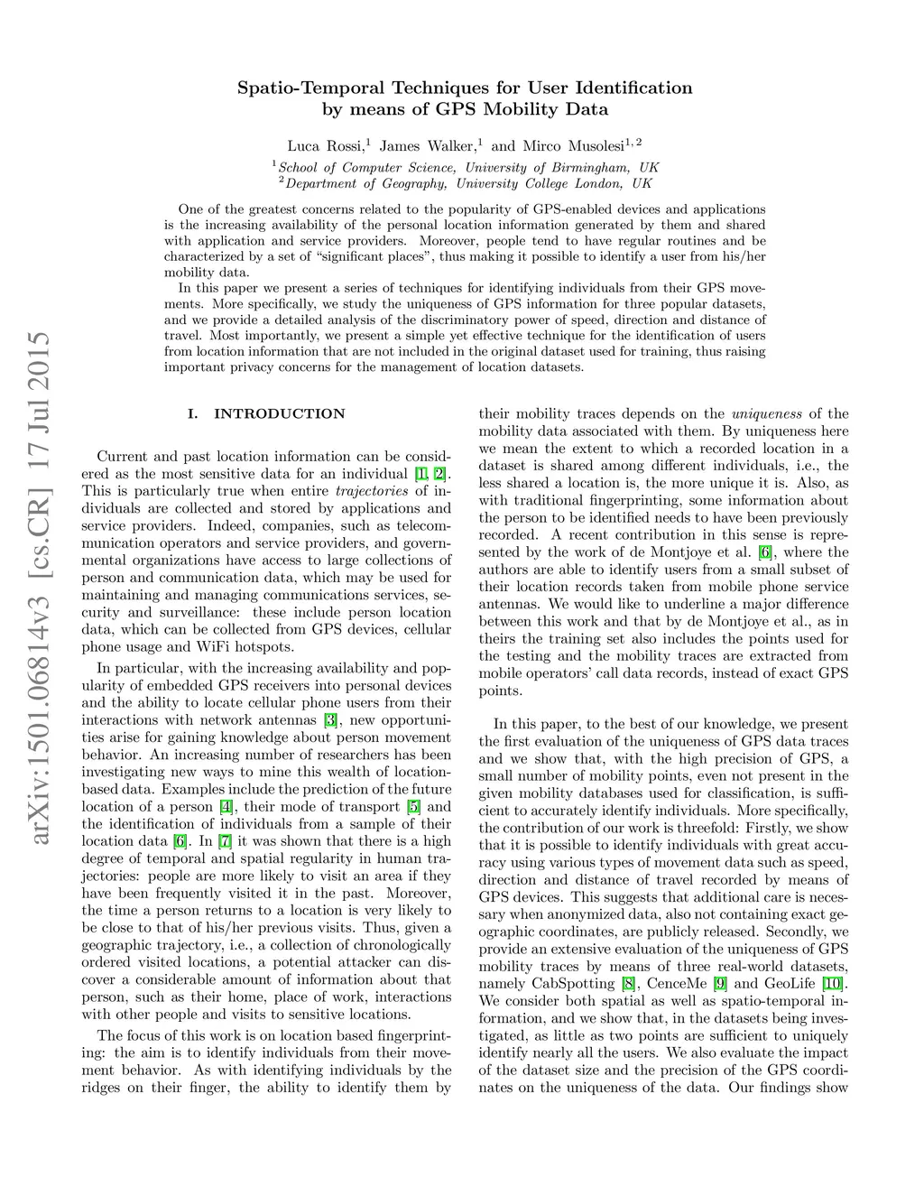 Spatio-Temporal Techniques for User Identification by means of GPS
