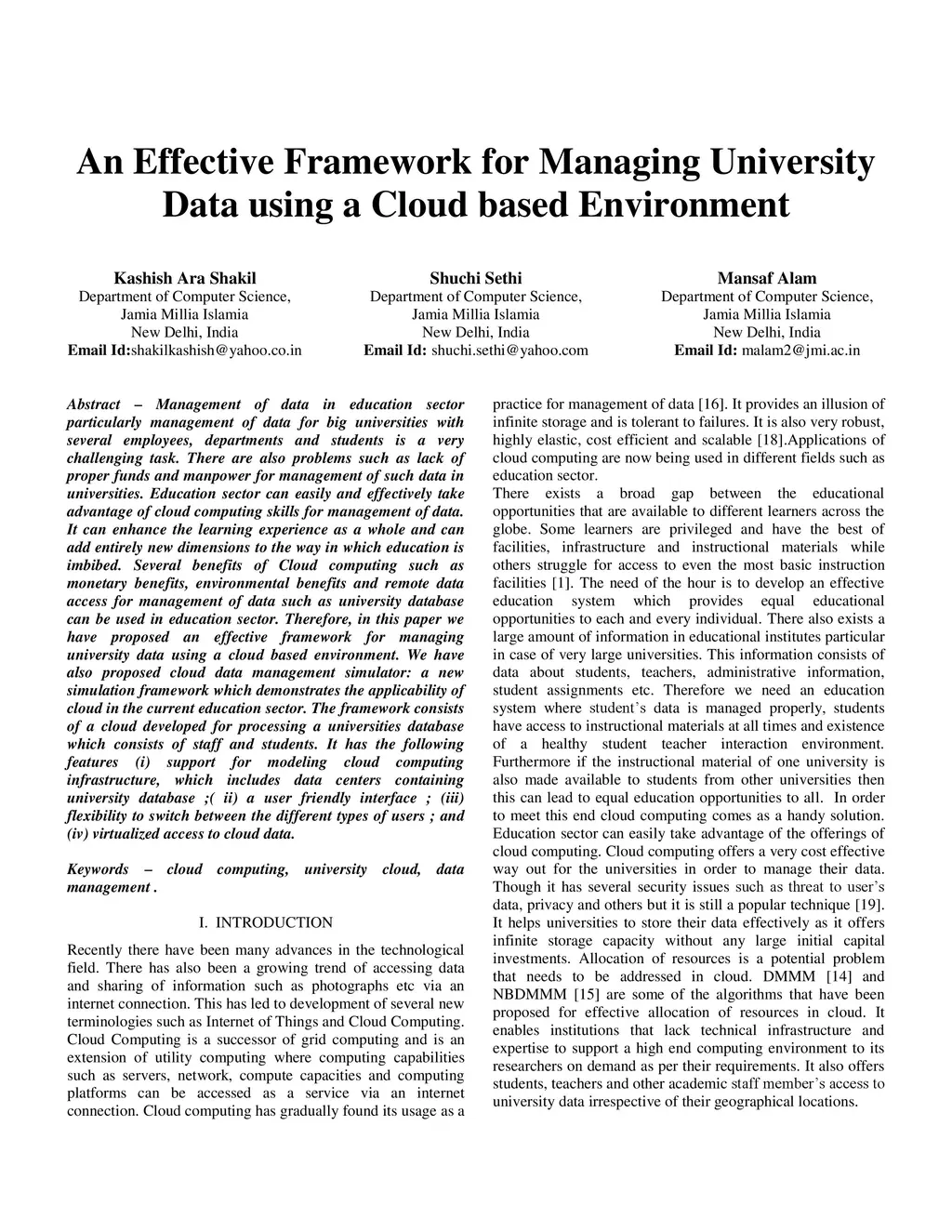 Management of data in education sector particularly management of data for big universities with several employees, departments and students is a very challenging task. There are also problems such as lack of proper funds and manpower for management of such data in universities. Education sector can easily and effectively take advantage of cloud computing skills for management of data. It can enhance the learning experience as a whole and can add entirely new dimensions to the way in which education is imbibed. Several benefits of Cloud computing such as monetary benefits, environmental benefits and remote data access for management of data such as university database can be used in education sector. Therefore, in this paper we have proposed an effective framework for managing university data using a cloud based environment. We have also proposed cloud data management simulator: a new simulation framework which demonstrates the applicability of cloud in the current education sector. The framework consists of a cloud developed for processing a universities database which consists of staff and students. It has the following features (i) support for modeling cloud computing infrastructure, which includes data centers containing university database; (ii) a user friendly interface; (iii) flexibility to switch between the different types of users; and (iv) virtualized access to cloud data.