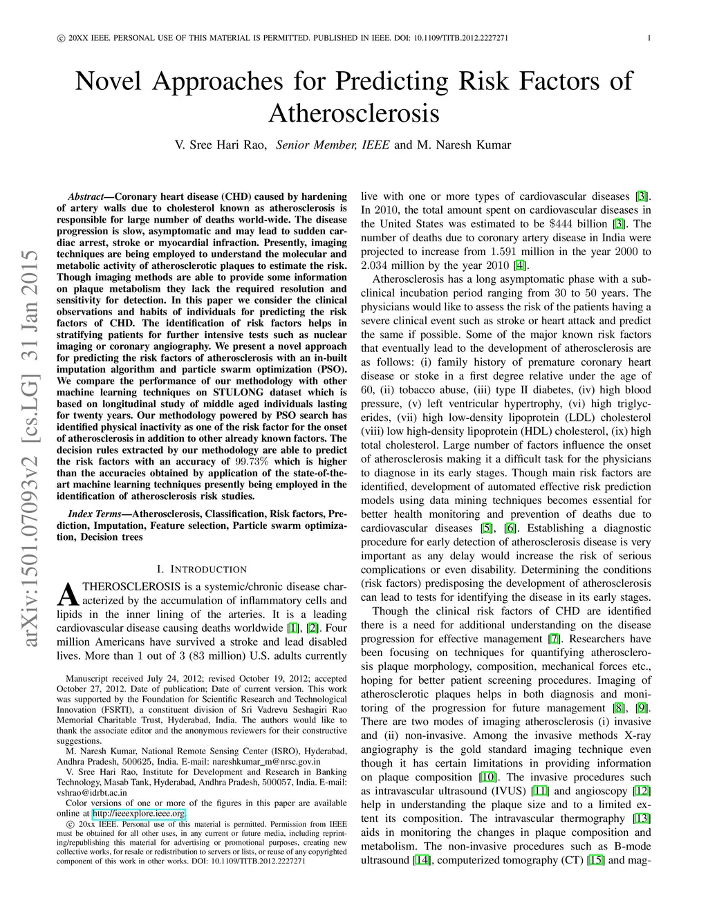 Novel Approaches for Predicting Risk Factors of Atherosclerosis