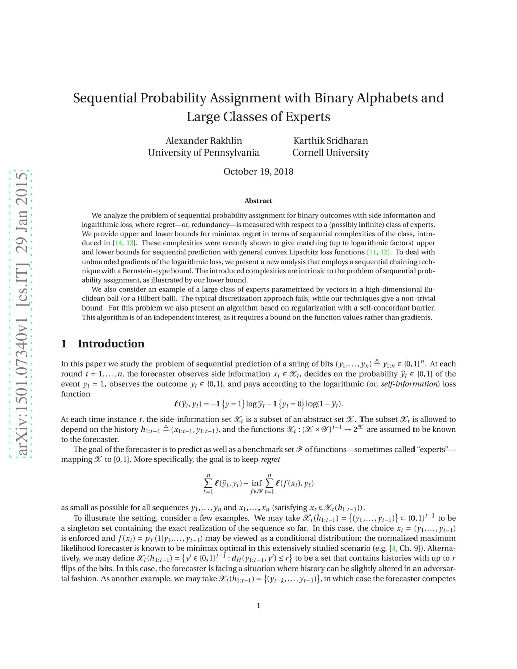 We analyze the problem of sequential probability assignment for binary outcomes with side information and logarithmic loss, where regret---or, redundancy---is measured with respect to a (possibly infinite) class of experts. We provide upper and lower bounds for minimax regret in terms of sequential complexities of the class. These complexities were recently shown to give matching (up to logarithmic factors) upper and lower bounds for sequential prediction with general convex Lipschitz loss functions (Rakhlin and Sridharan, 2015). To deal with unbounded gradients of the logarithmic loss, we present a new analysis that employs a sequential chaining technique with a Bernstein-type bound. The introduced complexities are intrinsic to the problem of sequential probability assignment, as illustrated by our lower bound. We also consider an example of a large class of experts parametrized by vectors in a high-dimensional Euclidean ball (or a Hilbert ball). The typical discretization approach fails, while our techniques give a non-trivial bound. For this problem we also present an algorithm based on regularization with a self-concordant barrier. This algorithm is of an independent interest, as it requires a bound on the function values rather than gradients.