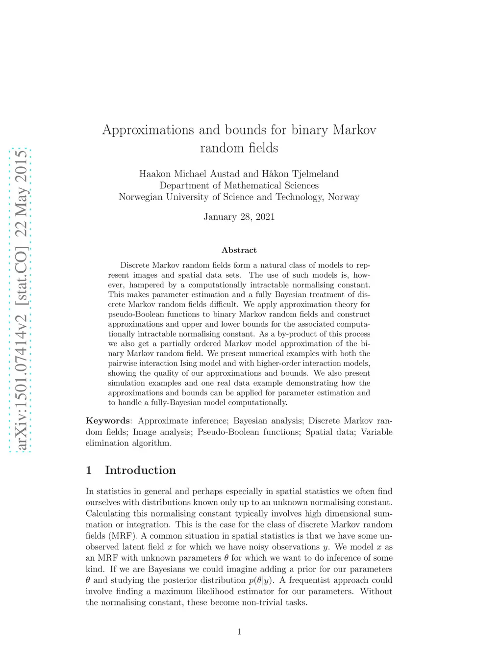 Discrete Markov random fields form a natural class of models to represent images and spatial data sets. The use of such models is, however, hampered by a computationally intractable normalising constant. This makes parameter estimation and a fully Bayesian treatment of discrete Markov random fields difficult. We apply approximation theory for pseudo-Boolean functions to binary Markov random fields and construct approximations and upper and lower bounds for the associated computationally intractable normalising constant. As a by-product of this process we also get a partially ordered Markov model approximation of the binary Markov random field. We present numerical examples with both the pairwise interaction Ising model and with higher-order interaction models, showing the quality of our approximations and bounds. We also present simulation examples and one real data example demonstrating how the approximations and bounds can be applied for parameter estimation and to handle a fully-Bayesian model computationally.