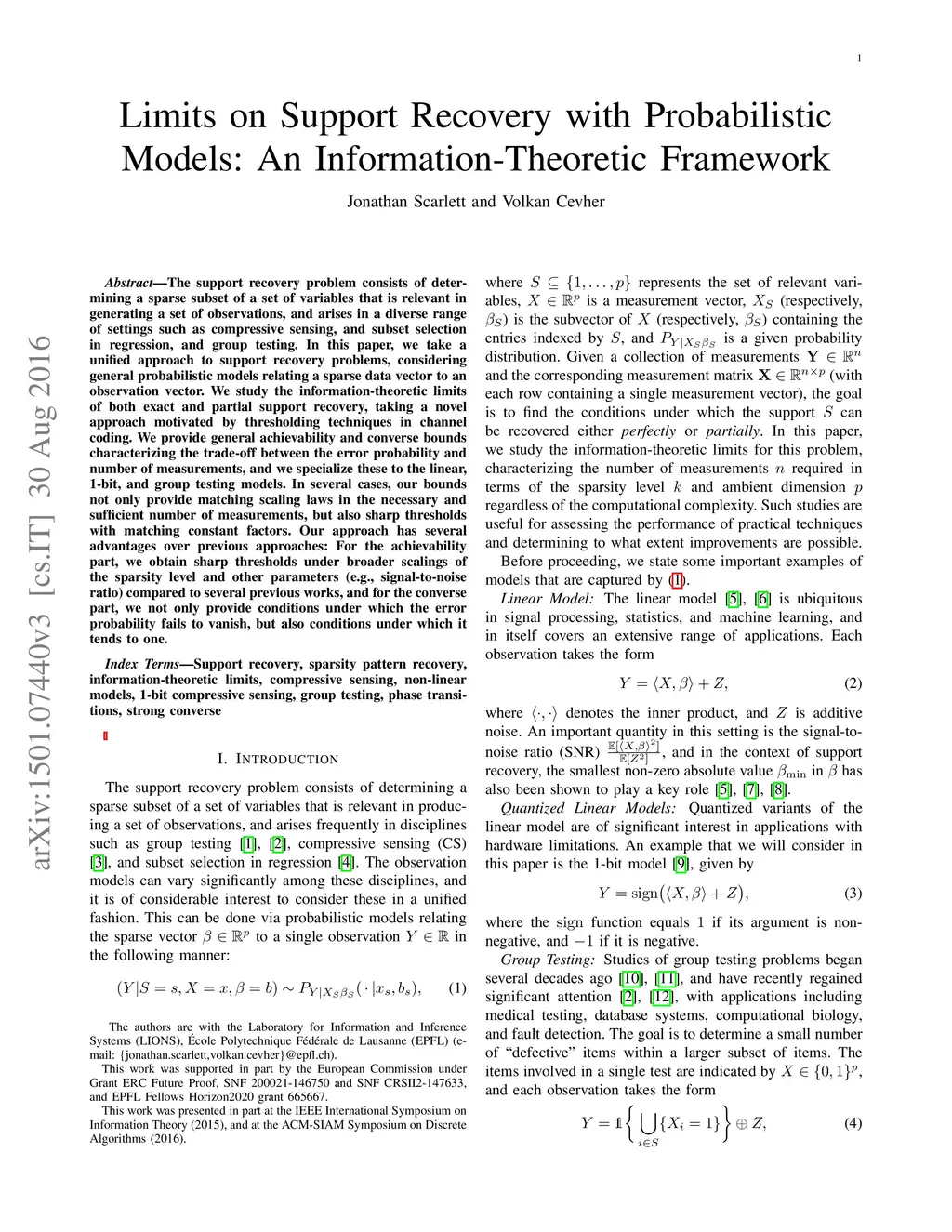 The support recovery problem consists of determining a sparse subset of a set of variables that is relevant in generating a set of observations, and arises in a diverse range of settings such as compressive sensing, and subset selection in regression, and group testing. In this paper, we take a unified approach to support recovery problems, considering general probabilistic models relating a sparse data vector to an observation vector. We study the information-theoretic limits of both exact and partial support recovery, taking a novel approach motivated by thresholding techniques in channel coding. We provide general achievability and converse bounds characterizing the trade-off between the error probability and number of measurements, and we specialize these to the linear, 1-bit, and group testing models. In several cases, our bounds not only provide matching scaling laws in the necessary and sufficient number of measurements, but also sharp thresholds with matching constant factors. Our approach has several advantages over previous approaches: For the achievability part, we obtain sharp thresholds under broader scalings of the sparsity level and other parameters (e.g., signal-to-noise ratio) compared to several previous works, and for the converse part, we not only provide conditions under which the error probability fails to vanish, but also conditions under which it tends to one.