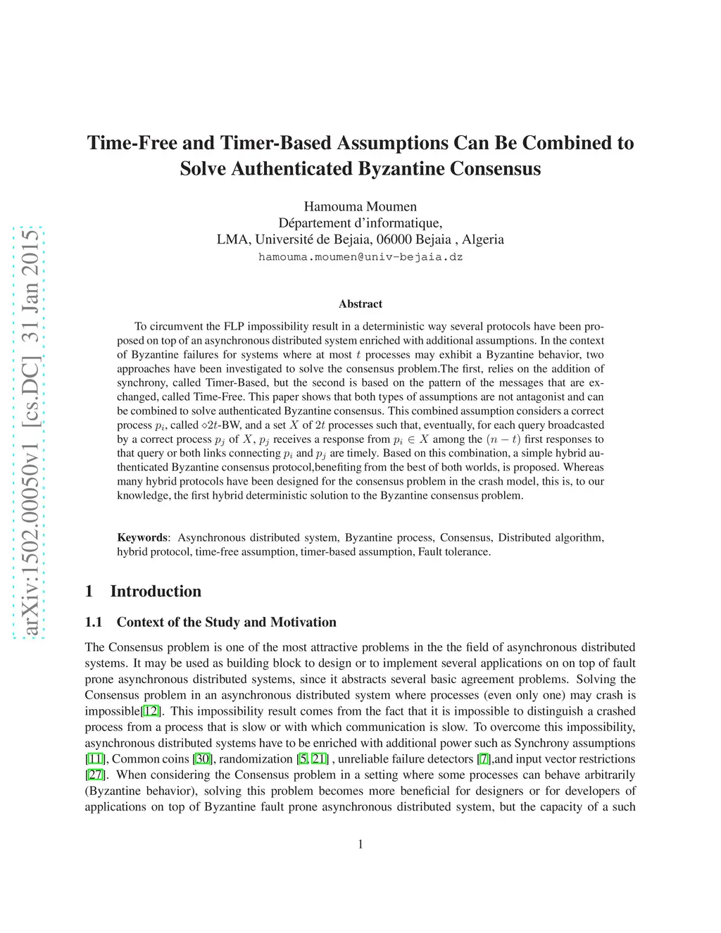 To circumvent the FLP impossibility result in a deterministic way several protocols have been proposed on top of an asynchronous distributed system enriched with additional assumptions. In the context of Byzantine failures for systems where at most t processes may exhibit a Byzantine behavior, two approaches have been investigated to solve the consensus problem.The first, relies on the addition of synchrony, called Timer-Based, but the second is based on the pattern of the messages that are exchanged, called Time-Free. This paper shows that both types of assumptions are not antagonist and can be combined to solve authenticated Byzantine consensus. This combined assumption considers a correct process pi, called 2t-BW, and a set X of 2t processes such that, eventually, for each query broadcasted by a correct process pj of X, pj receives a response from pi 2 X among the (n- t) first responses to that query or both links connecting pi and pj are timely. Based on this combination, a simple hybrid authenticated Byzantine consensus protocol,benefiting from the best of both worlds, is proposed. Whereas many hybrid protocols have been designed for the consensus problem in the crash model, this is, to our knowledge, the first hybrid deterministic solution to the Byzantine consensus problem.