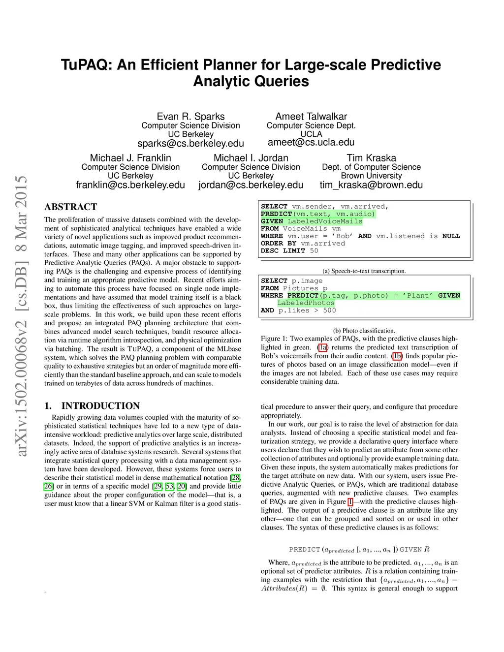 TuPAQ: An Efficient Planner for Large-scale Predictive Analytic Queries