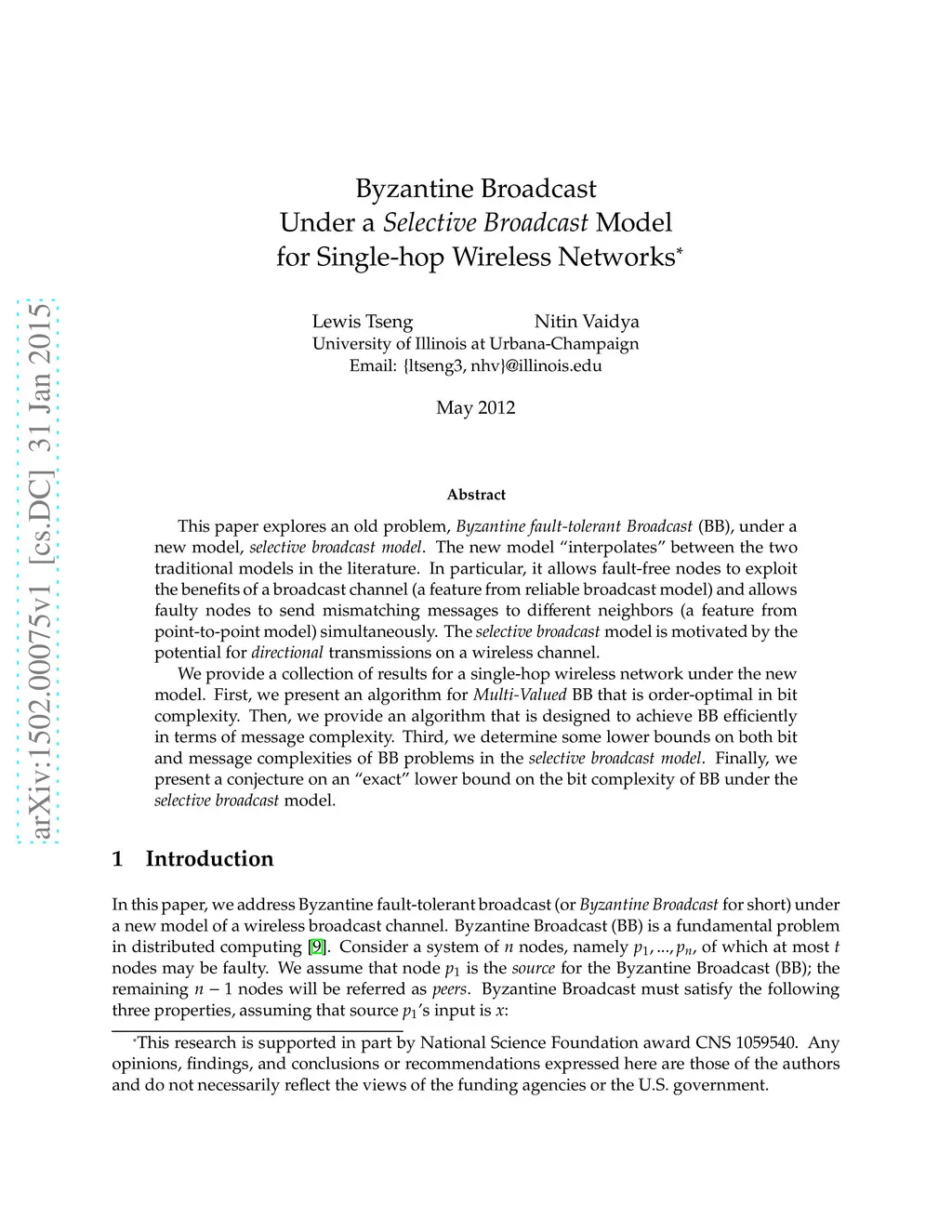 This paper explores an old problem, {\em Byzantine fault-tolerant Broadcast} (BB), under a new model, {\em selective broadcast model}. The new model "interpolates" between the two traditional models in the literature. In particular, it allows fault-free nodes to exploit the benefits of a broadcast channel (a feature from reliable broadcast model) and allows faulty nodes to send mismatching messages to different neighbors (a feature from point-to-point model) simultaneously. The {\em selective broadcast} model is motivated by the potential for {\em directional} transmissions on a wireless channel. We provide a collection of results for a single-hop wireless network under the new model. First, we present an algorithm for {\em Multi-Valued} BB that is order-optimal in bit complexity. Then, we provide an algorithm that is designed to achieve BB efficiently in terms of message complexity. Third, we determine some lower bounds on both bit and message complexities of BB problems in the {\em selective broadcast model}. Finally, we present a conjecture on an "exact" lower bound on the bit complexity of BB under the {\em selective broadcast} model.