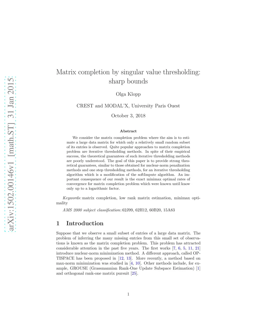 We consider the matrix completion problem where the aim is to esti-mate a large data matrix for which only a relatively small random subset of its entries is observed. Quite popular approaches to matrix completion problem are iterative thresholding methods. In spite of their empirical success, the theoretical guarantees of such iterative thresholding methods are poorly understood. The goal of this paper is to provide strong theo-retical guarantees, similar to those obtained for nuclear-norm penalization methods and one step thresholding methods, for an iterative thresholding algorithm which is a modification of the softImpute algorithm. An im-portant consequence of our result is the exact minimax optimal rates of convergence for matrix completion problem which were known until know only up to a logarithmic factor.
