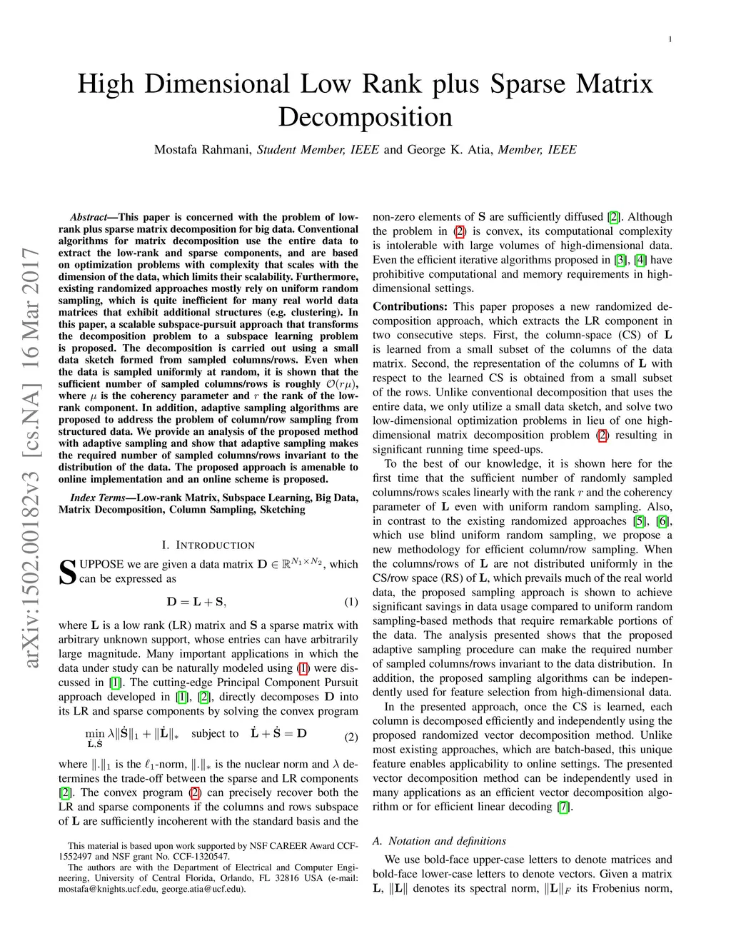High Dimensional Low Rank plus Sparse Matrix Decomposition