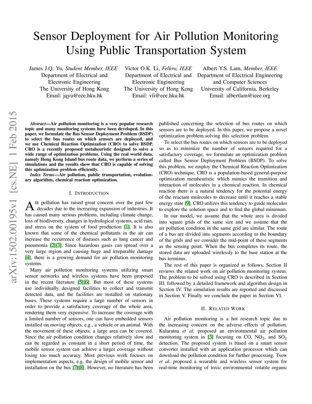 Air pollution monitoring is a very popular research topic and many monitoring systems have been developed. In this paper, we formulate the Bus Sensor Deployment Problem (BSDP) to select the bus routes on which sensors are deployed, and we use Chemical Reaction Optimization (CRO) to solve BSDP. CRO is a recently proposed metaheuristic designed to solve a wide range of optimization problems. Using the real world data, namely Hong Kong Island bus route data, we perform a series of simulations and the results show that CRO is capable of solving this optimization problem efficiently.