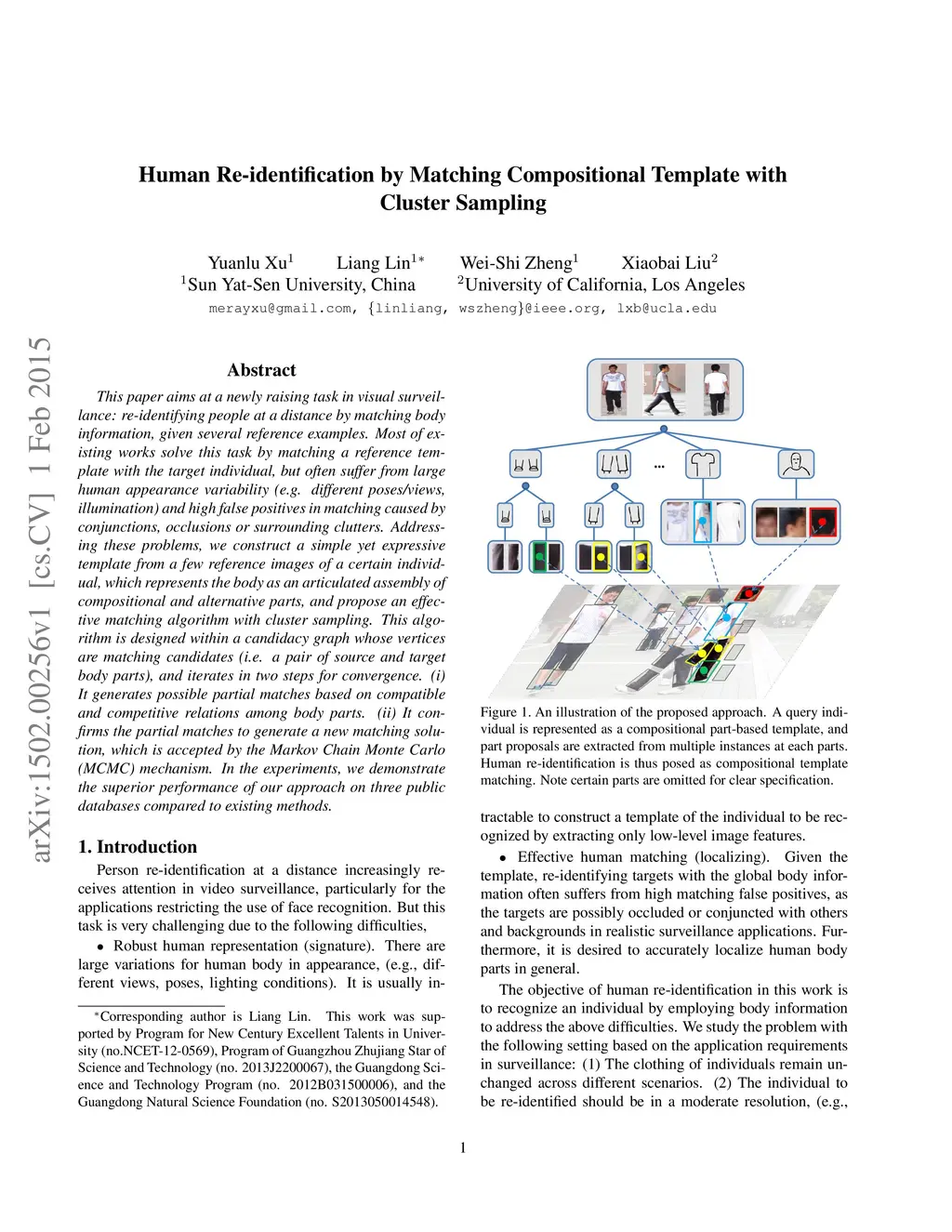 This paper aims at a newly raising task in visual surveillance: re-identifying people at a distance by matching body information, given several reference examples. Most of existing works solve this task by matching a reference template with the target individual, but often suffer from large human appearance variability (e.g. different poses/views, illumination) and high false positives in matching caused by conjunctions, occlusions or surrounding clutters. Addressing these problems, we construct a simple yet expressive template from a few reference images of a certain individual, which represents the body as an articulated assembly of compositional and alternative parts, and propose an effective matching algorithm with cluster sampling. This algorithm is designed within a candidacy graph whose vertices are matching candidates (i.e. a pair of source and target body parts), and iterates in two steps for convergence. (i) It generates possible partial matches based on compatible and competitive relations among body parts. (ii) It confirms the partial matches to generate a new matching solution, which is accepted by the Markov Chain Monte Carlo (MCMC) mechanism. In the experiments, we demonstrate the superior performance of our approach on three public databases compared to existing methods.