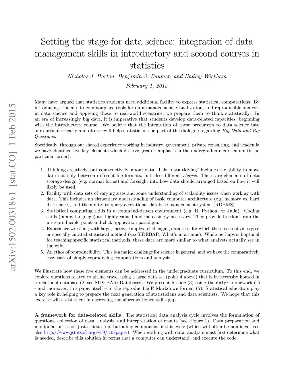 Many have argued that statistics students need additional facility to express statistical computations. By introducing students to commonplace tools for data management, visualization, and reproducible analysis in data science and applying these to real-world scenarios, we prepare them to think statistically. In an era of increasingly big data, it is imperative that students develop data-related capacities, beginning with the introductory course. We believe that the integration of these precursors to data science into our curricula-early and often-will help statisticians be part of the dialogue regarding "Big Data" and "Big Questions".