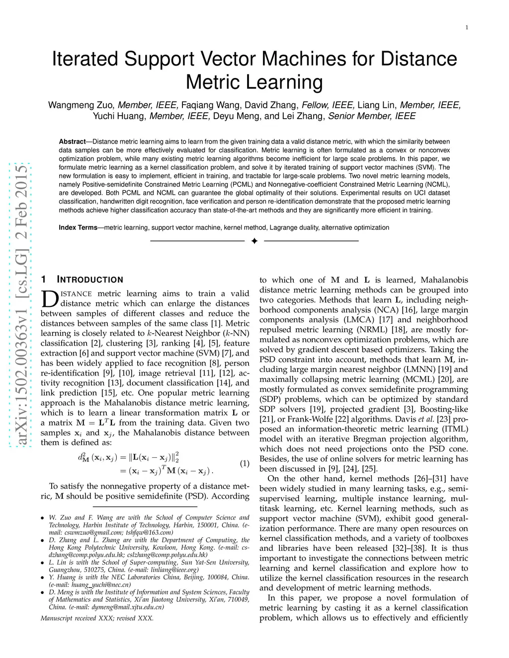 Distance metric learning aims to learn from the given training data a valid distance metric, with which the similarity between data samples can be more effectively evaluated for classification. Metric learning is often formulated as a convex or nonconvex optimization problem, while many existing metric learning algorithms become inefficient for large scale problems. In this paper, we formulate metric learning as a kernel classification problem, and solve it by iterated training of support vector machines (SVM). The new formulation is easy to implement, efficient in training, and tractable for large-scale problems. Two novel metric learning models, namely Positive-semidefinite Constrained Metric Learning (PCML) and Nonnegative-coefficient Constrained Metric Learning (NCML), are developed. Both PCML and NCML can guarantee the global optimality of their solutions. Experimental results on UCI dataset classification, handwritten digit recognition, face verification and person re-identification demonstrate that the proposed metric learning methods achieve higher classification accuracy than state-of-the-art methods and they are significantly more efficient in training.