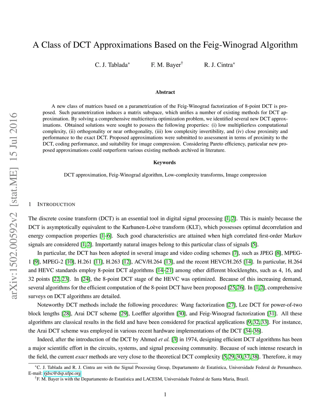 A new class of matrices based on a parametrization of the Feig-Winograd factorization of 8-point DCT is proposed. Such parametrization induces a matrix subspace, which unifies a number of existing methods for DCT approximation. By solving a comprehensive multicriteria optimization problem, we identified several new DCT approximations. Obtained solutions were sought to possess the following properties: (i) low multiplierless computational complexity, (ii) orthogonality or near orthogonality, (iii) low complexity invertibility, and (iv) close proximity and performance to the exact DCT. Proposed approximations were submitted to assessment in terms of proximity to the DCT, coding performance, and suitability for image compression. Considering Pareto efficiency, particular new proposed approximations could outperform various existing methods archived in literature.