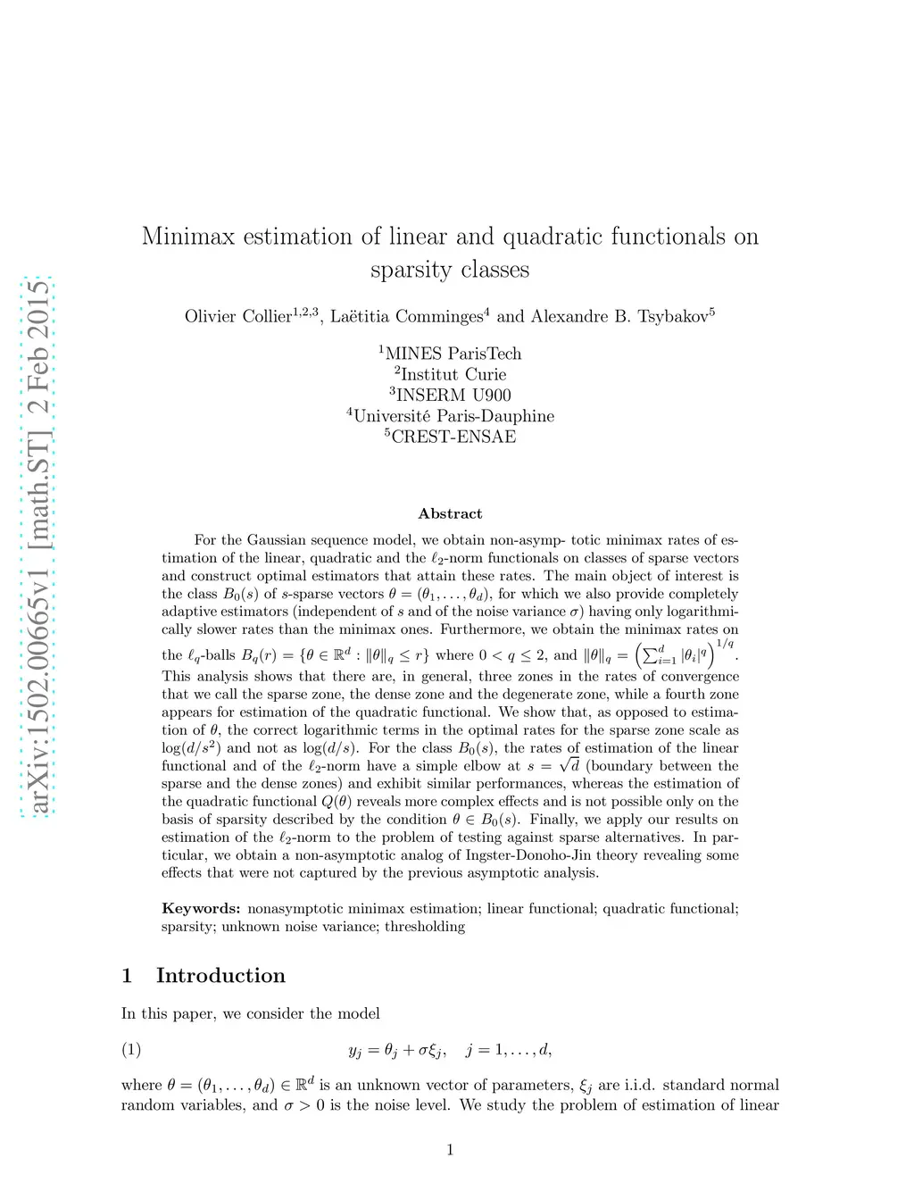 For the Gaussian sequence model, we obtain non-asymptotic minimax rates of estimation of the linear, quadratic and the L2-norm functionals on classes of sparse vectors and construct optimal estimators that attain these rates. The main object of interest is the class s-sparse vectors for which we also provide completely adaptive estimators (independent of s and of the noise variance) having only logarithmically slower rates than the minimax ones. Furthermore, we obtain the minimax rates on the Lq-balls where 0 < q < 2. This analysis shows that there are, in general, three zones in the rates of convergence that we call the sparse zone, the dense zone and the degenerate zone, while a fourth zone appears for estimation of the quadratic functional. We show that, as opposed to estimation of the vector, the correct logarithmic terms in the optimal rates for the sparse zone scale as log(d/s^2) and not as log(d/s). For the sparse class, the rates of estimation of the linear functional and of the L2-norm have a simple elbow at s = sqrt(d) (boundary between the sparse and the dense zones) and exhibit similar performances, whereas the estimation of the quadratic functional reveals more complex effects and is not possible only on the basis of sparsity described by the sparsity condition on the vector. Finally, we apply our results on estimation of the L2-norm to the problem of testing against sparse alternatives. In particular, we obtain a non-asymptotic analog of the Ingster-Donoho-Jin theory revealing some effects that were not captured by the previous asymptotic analysis.