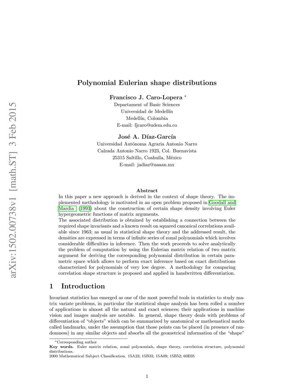 In this paper a new approach is derived in the context of shape theory. The implemented methodology is motivated in an open problem proposed in \citet{GM93} about the construction of certain shape density involving Euler hypergeometric functions of matrix arguments. The associated distribution is obtained by establishing a connection between the required shape invariants and a known result on canonical correlations available since 1963; as usual in statistical shape theory and the addressed result, the densities are expressed in terms of infinite series of zonal polynomials which involves considerable difficulties in inference. Then the work proceeds to solve analytically the problem of computation by using the Eulerian matrix relation of two matrix argument for deriving the corresponding polynomial distribution in certain parametric space which allows to perform exact inference based on exact distributions characterized for polynomials of very low degree. A methodology for comparing correlation shape structure is proposed and applied in handwritten differentiation.