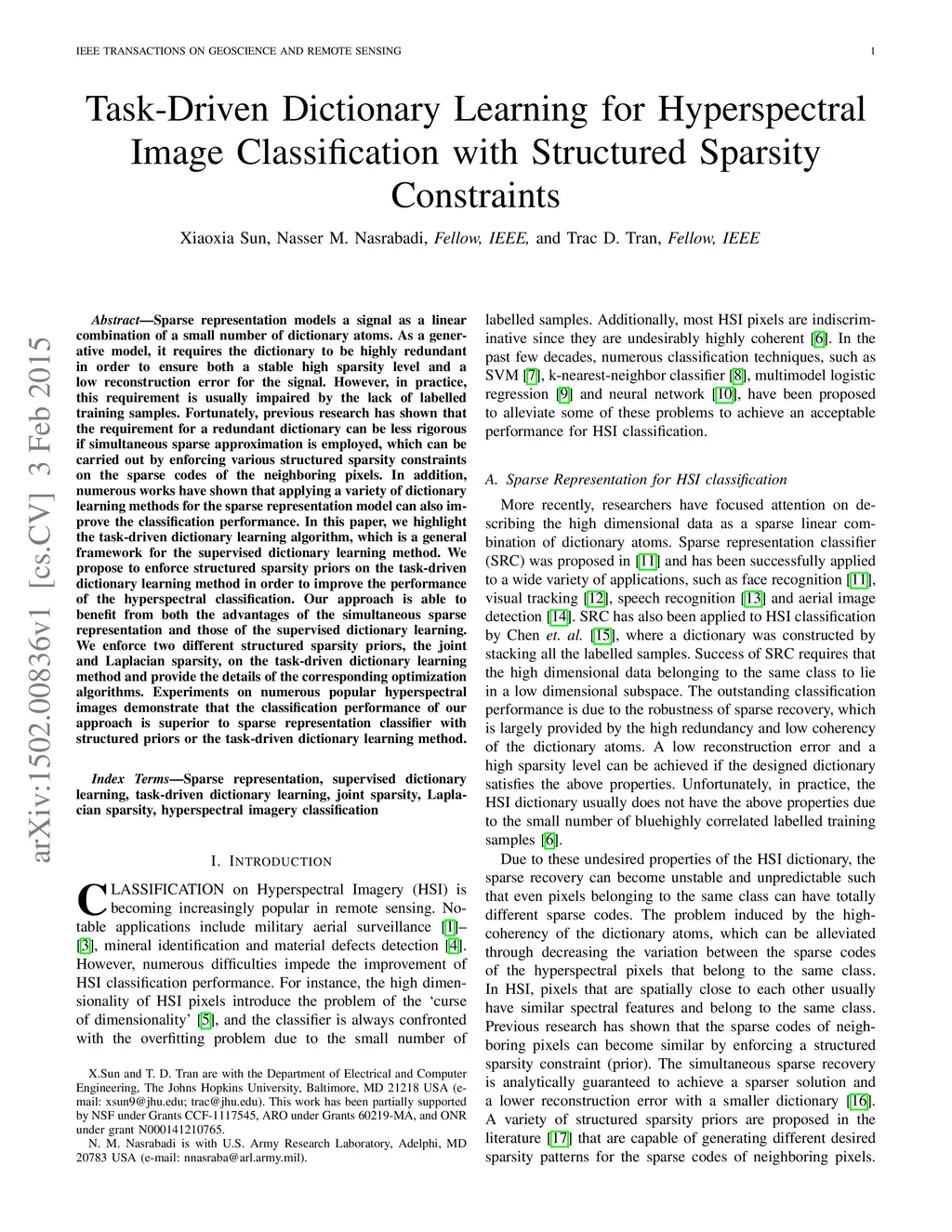 Task-Driven Dictionary Learning for Hyperspectral Image Classification