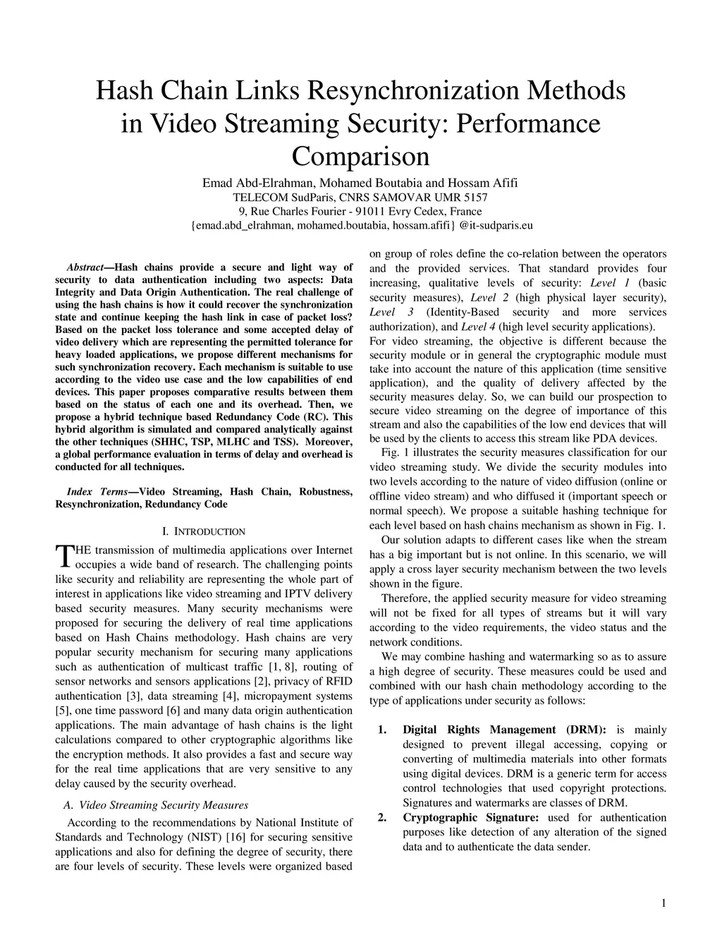 Hash chains provide a secure and light way of security to data authentication including two aspects: Data Integrity and Data Origin Authentication. The real challenge of using the hash chains is how it could recover the synchronization state and continue keeping the hash link in case of packet loss? Based on the packet loss tolerance and some accepted delay of video delivery which are representing the permitted tolerance for heavy loaded applications, we propose different mechanisms for such synchronization recovery. Each mechanism is suitable to use according to the video use case and the low capabilities of end devices. This paper proposes comparative results between them based on the status of each one and its overhead. Then, we propose a hybrid technique based Redundancy Code (RC). This hybrid algorithm is simulated and compared analytically against the other techniques (SHHC, TSP, MLHC and TSS). Moreover, a global performance evaluation in terms of delay and overhead is conducted for all techniques.