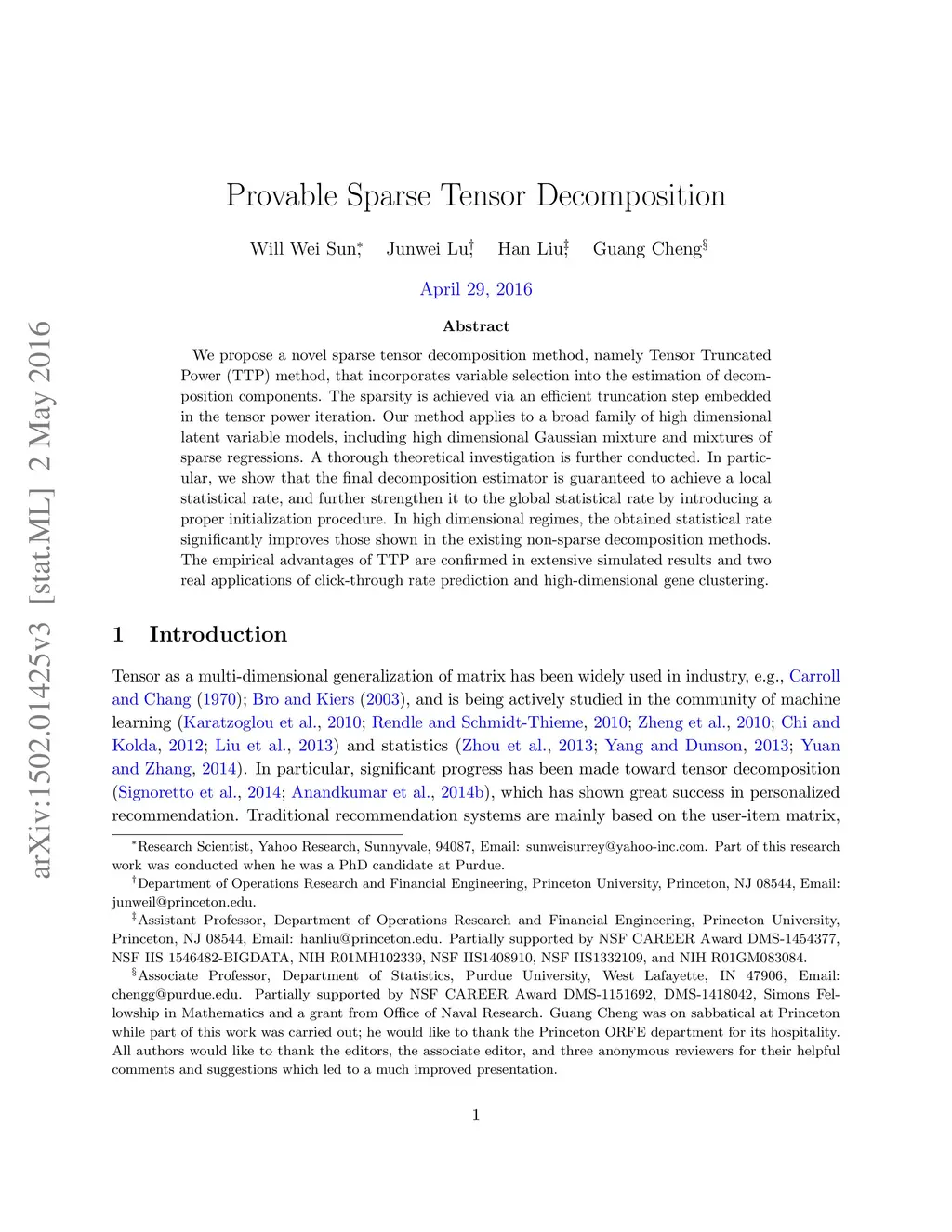 We propose a novel sparse tensor decomposition method, namely Tensor Truncated Power (TTP) method, that incorporates variable selection into the estimation of decomposition components. The sparsity is achieved via an efficient truncation step embedded in the tensor power iteration. Our method applies to a broad family of high dimensional latent variable models, including high dimensional Gaussian mixture and mixtures of sparse regressions. A thorough theoretical investigation is further conducted. In particular, we show that the final decomposition estimator is guaranteed to achieve a local statistical rate, and further strengthen it to the global statistical rate by introducing a proper initialization procedure. In high dimensional regimes, the obtained statistical rate significantly improves those shown in the existing non-sparse decomposition methods. The empirical advantages of TTP are confirmed in extensive simulated results and two real applications of click-through rate prediction and high-dimensional gene clustering.