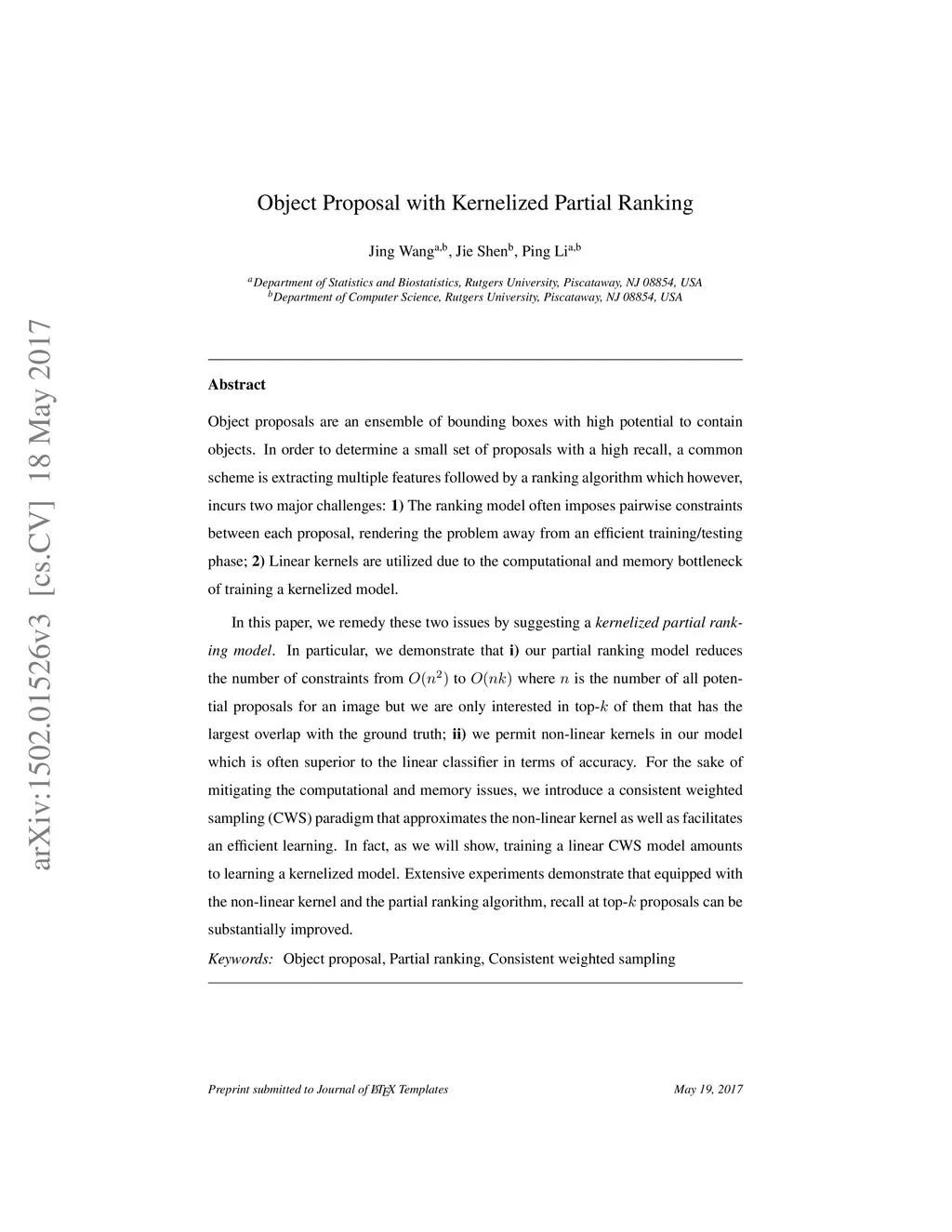 Object proposals are an ensemble of bounding boxes with high potential to contain objects. In order to determine a small set of proposals with a high recall, a common scheme is extracting multiple features followed by a ranking algorithm which however, incurs two major challenges: {\bf 1)} The ranking model often imposes pairwise constraints between each proposal, rendering the problem away from an efficient training/testing phase; {\bf 2)} Linear kernels are utilized due to the computational and memory bottleneck of training a kernelized model. In this paper, we remedy these two issues by suggesting a {\em kernelized partial ranking model}. In particular, we demonstrate that {\bf i)} our partial ranking model reduces the number of constraints from to where is the number of all potential proposals for an image but we are only interested in top- of them that has the largest overlap with the ground truth; {\bf ii)} we permit non-linear kernels in our model which is often superior to the linear classifier in terms of accuracy. For the sake of mitigating the computational and memory issues, we introduce a consistent weighted sampling~(CWS) paradigm that approximates the non-linear kernel as well as facilitates an efficient learning. In fact, as we will show, training a linear CWS model amounts to learning a kernelized model. Extensive experiments demonstrate that equipped with the non-linear kernel and the partial ranking algorithm, recall at top- proposals can be substantially improved.