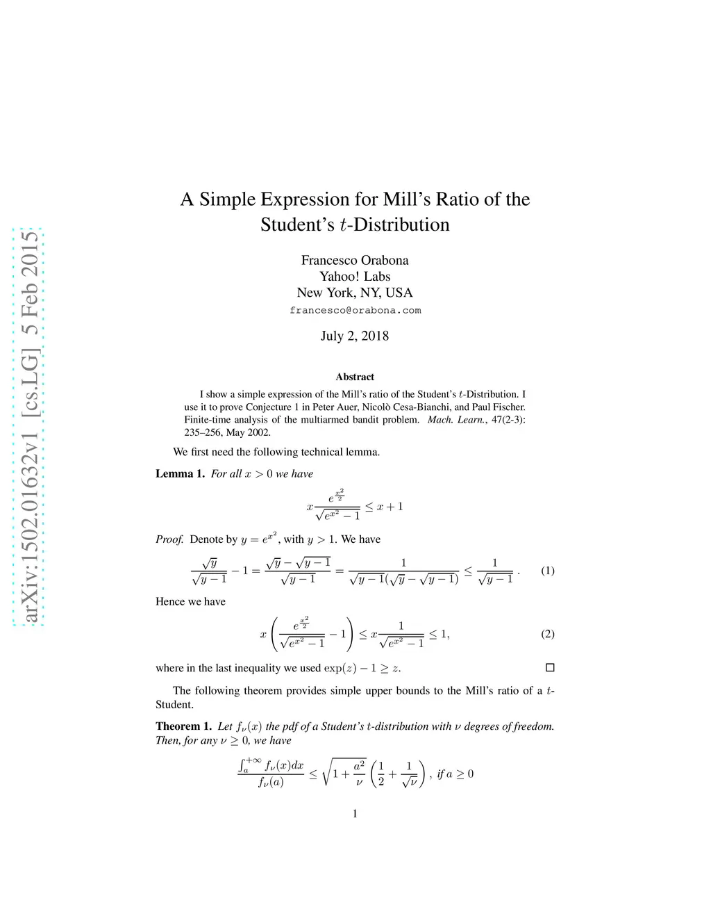 I show a simple expression of the Mill's ratio of the Student's t-Distribution. I use it to prove Conjecture 1 in P. Auer, N. Cesa-Bianchi, and P. Fischer. Finite-time analysis of the multiarmed bandit problem. Mach. Learn., 47(2-3):235--256, May 2002.