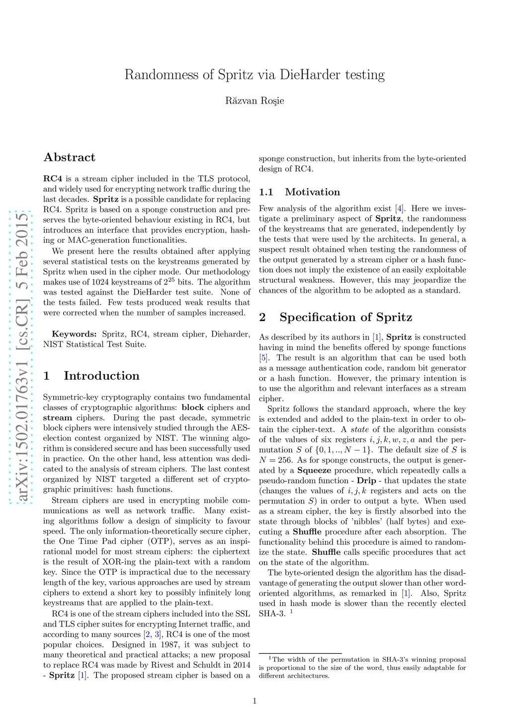 Randomness of Spritz via DieHarder testing