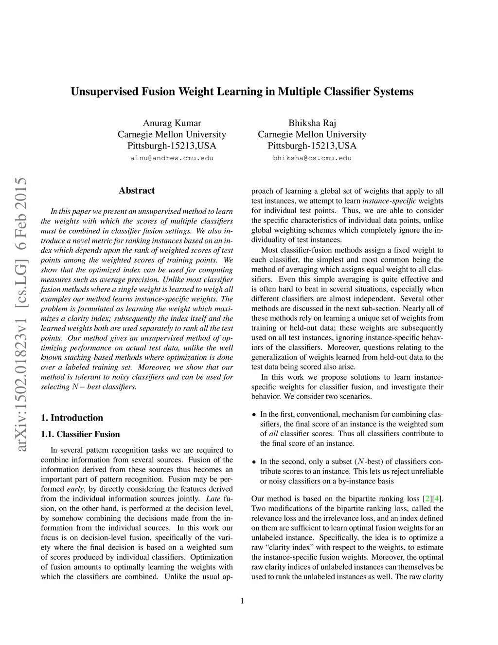In this paper we present an unsupervised method to learn the weights with which the scores of multiple classifiers must be combined in classifier fusion settings. We also introduce a novel metric for ranking instances based on an index which depends upon the rank of weighted scores of test points among the weighted scores of training points. We show that the optimized index can be used for computing measures such as average precision. Unlike most classifier fusion methods where a single weight is learned to weigh all examples our method learns instance-specific weights. The problem is formulated as learning the weight which maximizes a clarity index; subsequently the index itself and the learned weights both are used separately to rank all the test points. Our method gives an unsupervised method of optimizing performance on actual test data, unlike the well known stacking-based methods where optimization is done over a labeled training set. Moreover, we show that our method is tolerant to noisy classifiers and can be used for selecting N-best classifiers.