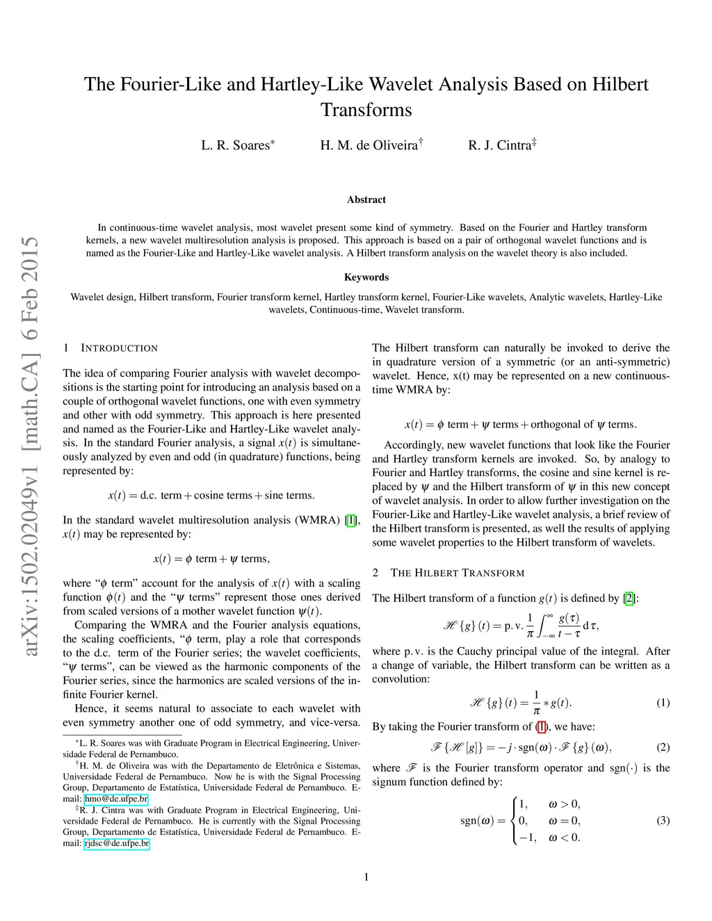 In continuous-time wavelet analysis, most wavelet present some kind of symmetry. Based on the Fourier and Hartley transform kernels, a new wavelet multiresolution analysis is proposed. This approach is based on a pair of orthogonal wavelet functions and is named as the Fourier-Like and Hartley-Like wavelet analysis. A Hilbert transform analysis on the wavelet theory is also included.