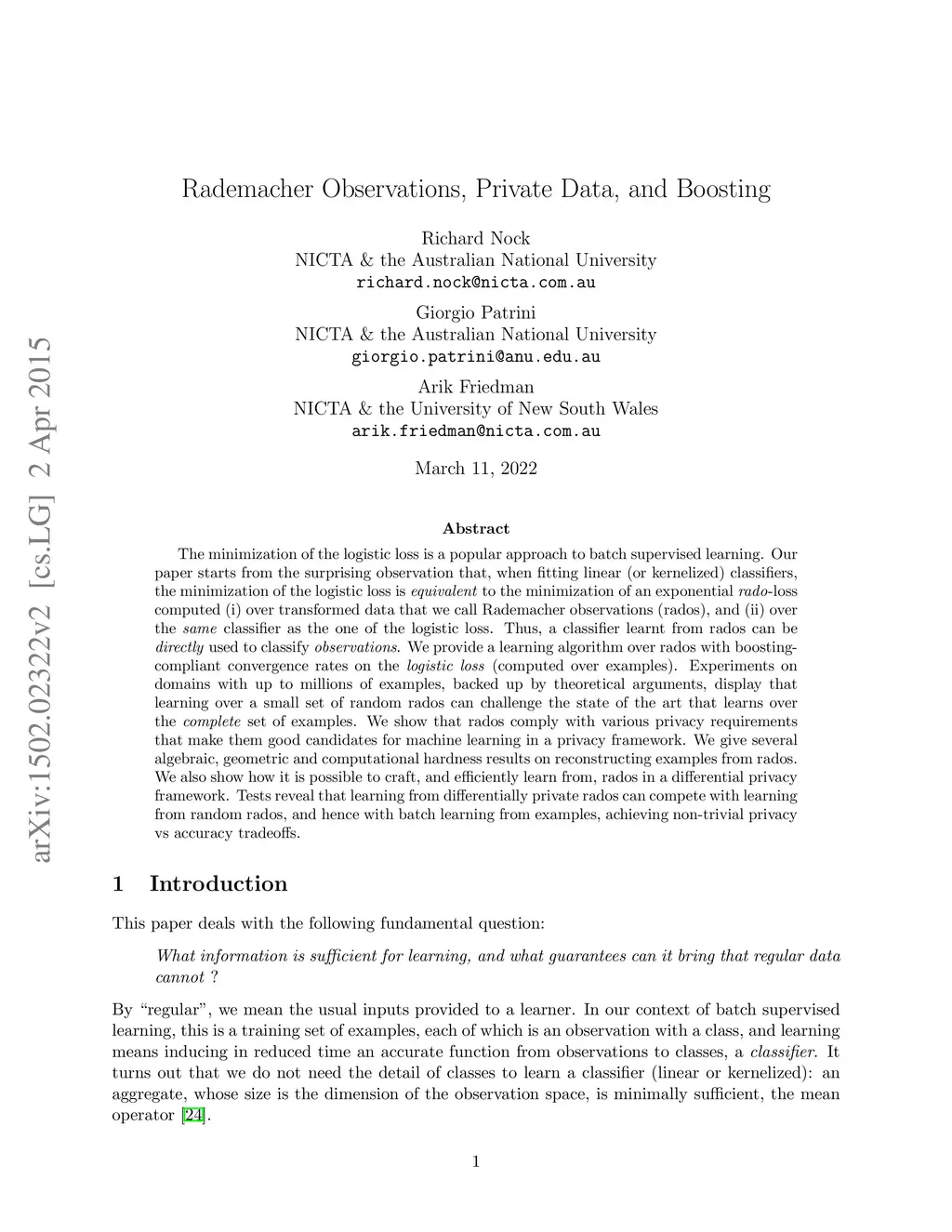 The minimization of the logistic loss is a popular approach to batch supervised learning. Our paper starts from the surprising observation that, when fitting linear (or kernelized) classifiers, the minimization of the logistic loss is \textit{equivalent} to the minimization of an exponential \textit{rado}-loss computed (i) over transformed data that we call Rademacher observations (rados), and (ii) over the \textit{same} classifier as the one of the logistic loss. Thus, a classifier learnt from rados can be \textit{directly} used to classify \textit{observations}. We provide a learning algorithm over rados with boosting-compliant convergence rates on the \textit{logistic loss} (computed over examples). Experiments on domains with up to millions of examples, backed up by theoretical arguments, display that learning over a small set of random rados can challenge the state of the art that learns over the \textit{complete} set of examples. We show that rados comply with various privacy requirements that make them good candidates for machine learning in a privacy framework. We give several algebraic, geometric and computational hardness results on reconstructing examples from rados. We also show how it is possible to craft, and efficiently learn from, rados in a differential privacy framework. Tests reveal that learning from differentially private rados can compete with learning from random rados, and hence with batch learning from examples, achieving non-trivial privacy vs accuracy tradeoffs.