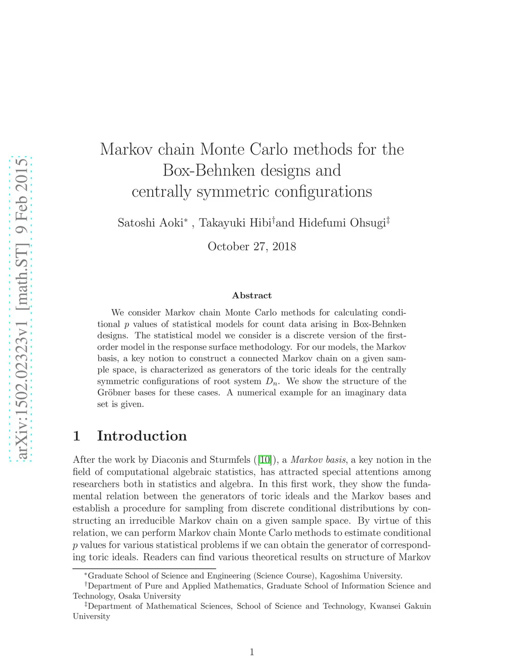 We consider Markov chain Monte Carlo methods for calculating conditional p values of statistical models for count data arising in Box-Behnken designs. The statistical model we consider is a discrete version of the first-order model in the response surface methodology. For our models, the Markov basis, a key notion to construct a connected Markov chain on a given sample space, is characterized as generators of the toric ideals for the centrally symmetric configurations of root system D_n. We show the structure of the Groebner bases for these cases. A numerical example for an imaginary data set is given.