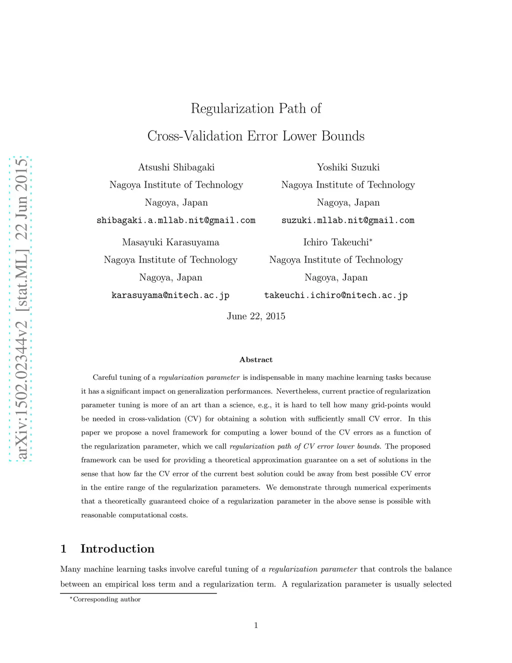 Careful tuning of a regularization parameter is indispensable in many machine learning tasks because it has a significant impact on generalization performances. Nevertheless, current practice of regularization parameter tuning is more of an art than a science, e.g., it is hard to tell how many grid-points would be needed in cross-validation (CV) for obtaining a solution with sufficiently small CV error. In this paper we propose a novel framework for computing a lower bound of the CV errors as a function of the regularization parameter, which we call regularization path of CV error lower bounds. The proposed framework can be used for providing a theoretical approximation guarantee on a set of solutions in the sense that how far the CV error of the current best solution could be away from best possible CV error in the entire range of the regularization parameters. We demonstrate through numerical experiments that a theoretically guaranteed a choice of regularization parameter in the above sense is possible with reasonable computational costs.