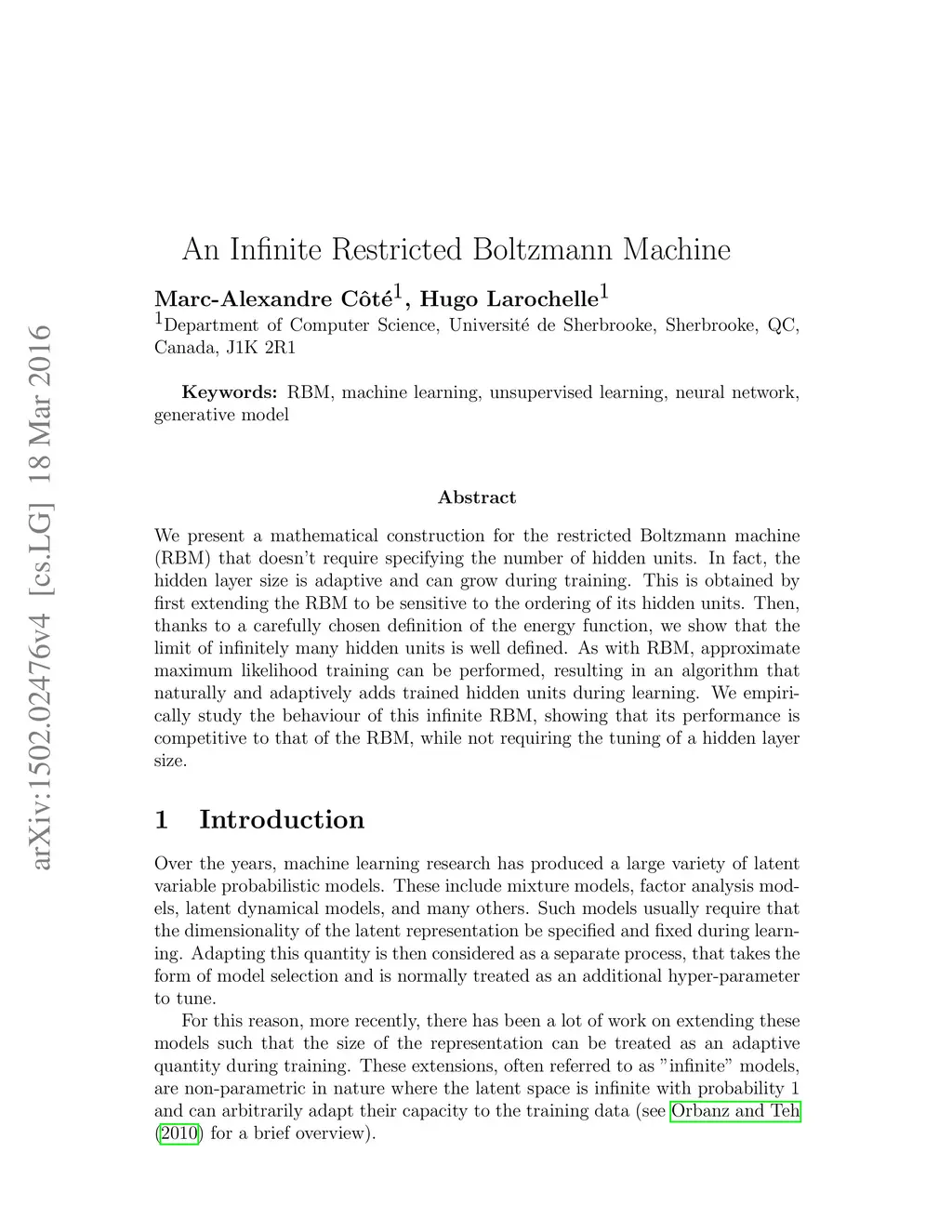 We present a mathematical construction for the restricted Boltzmann machine (RBM) that doesn't require specifying the number of hidden units. In fact, the hidden layer size is adaptive and can grow during training. This is obtained by first extending the RBM to be sensitive to the ordering of its hidden units. Then, thanks to a carefully chosen definition of the energy function, we show that the limit of infinitely many hidden units is well defined. As with RBM, approximate maximum likelihood training can be performed, resulting in an algorithm that naturally and adaptively adds trained hidden units during learning. We empirically study the behaviour of this infinite RBM, showing that its performance is competitive to that of the RBM, while not requiring the tuning of a hidden layer size.