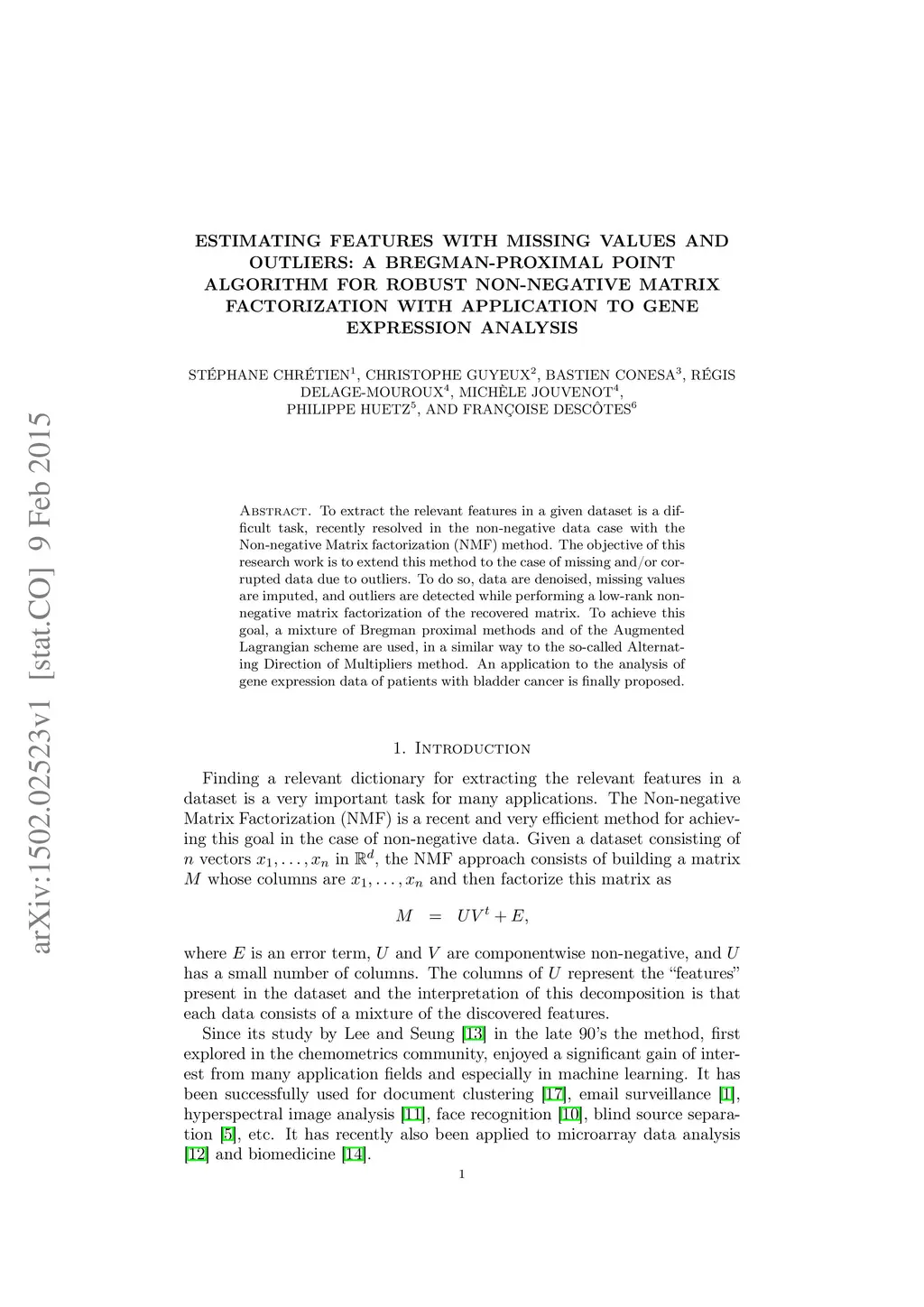 To extract the relevant features in a given dataset is a difficult task, recently resolved in the non-negative data case with the Non-negative Matrix factorization (NMF) method. The objective of this research work is to extend this method to the case of missing and/or corrupted data due to outliers. To do so, data are denoised, missing values are imputed, and outliers are detected while performing a low-rank non-negative matrix factorization of the recovered matrix. To achieve this goal, a mixture of Bregman proximal methods and of the Augmented Lagrangian scheme are used, in a similar way to the so-called Alternating Direction of Multipliers method. An application to the analysis of gene expression data of patients with bladder cancer is finally proposed.