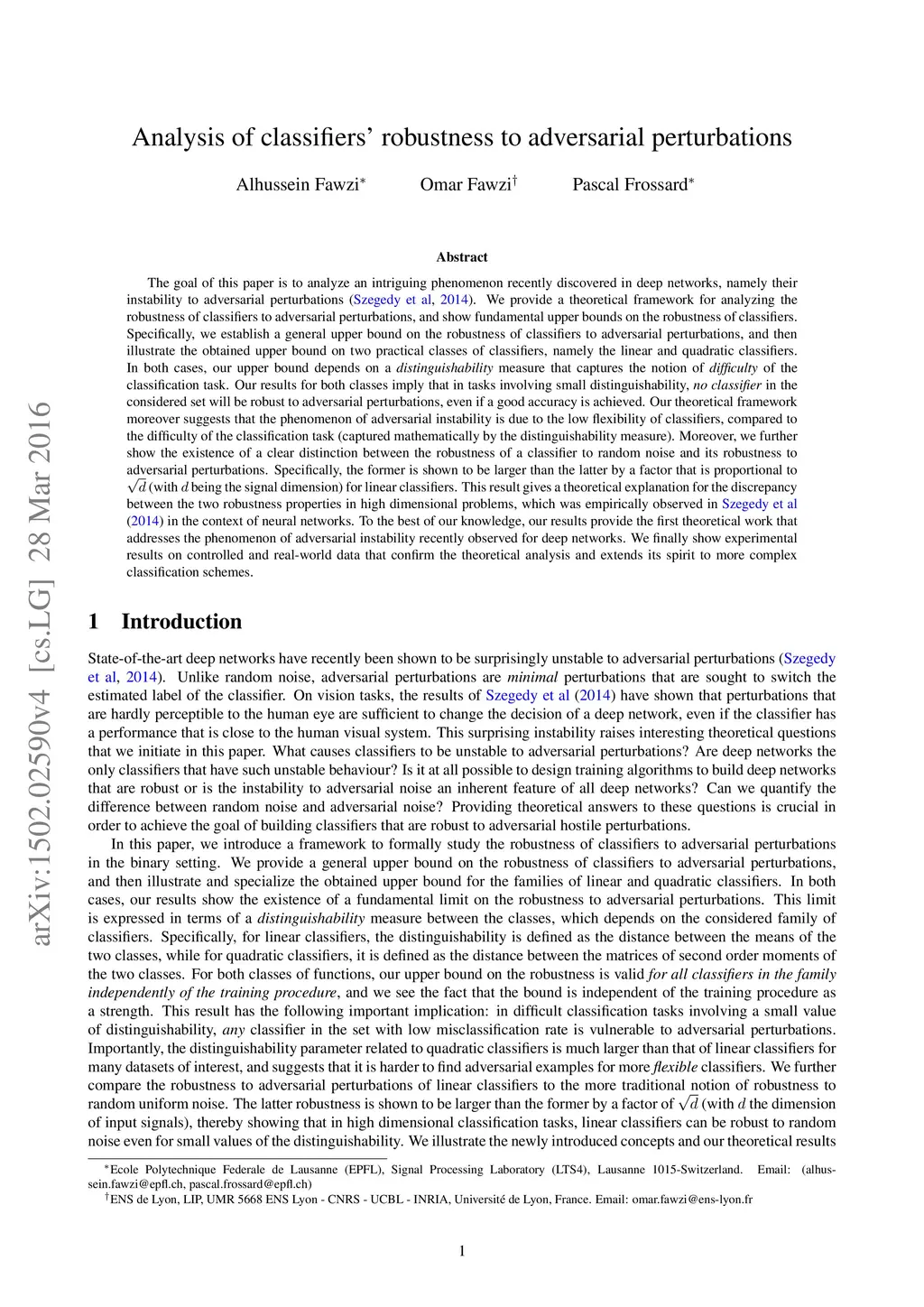 The goal of this paper is to analyze an intriguing phenomenon recently discovered in deep networks, namely their instability to adversarial perturbations (Szegedy et. al., 2014). We provide a theoretical framework for analyzing the robustness of classifiers to adversarial perturbations, and show fundamental upper bounds on the robustness of classifiers. Specifically, we establish a general upper bound on the robustness of classifiers to adversarial perturbations, and then illustrate the obtained upper bound on the families of linear and quadratic classifiers. In both cases, our upper bound depends on a distinguishability measure that captures the notion of difficulty of the classification task. Our results for both classes imply that in tasks involving small distinguishability, no classifier in the considered set will be robust to adversarial perturbations, even if a good accuracy is achieved. Our theoretical framework moreover suggests that the phenomenon of adversarial instability is due to the low flexibility of classifiers, compared to the difficulty of the classification task (captured by the distinguishability). Moreover, we show the existence of a clear distinction between the robustness of a classifier to random noise and its robustness to adversarial perturbations. Specifically, the former is shown to be larger than the latter by a factor that is proportional to \sqrt{d} (with d being the signal dimension) for linear classifiers. This result gives a theoretical explanation for the discrepancy between the two robustness properties in high dimensional problems, which was empirically observed in the context of neural networks. To the best of our knowledge, our results provide the first theoretical work that addresses the phenomenon of adversarial instability recently observed for deep networks. Our analysis is complemented by experimental results on controlled and real-world data.